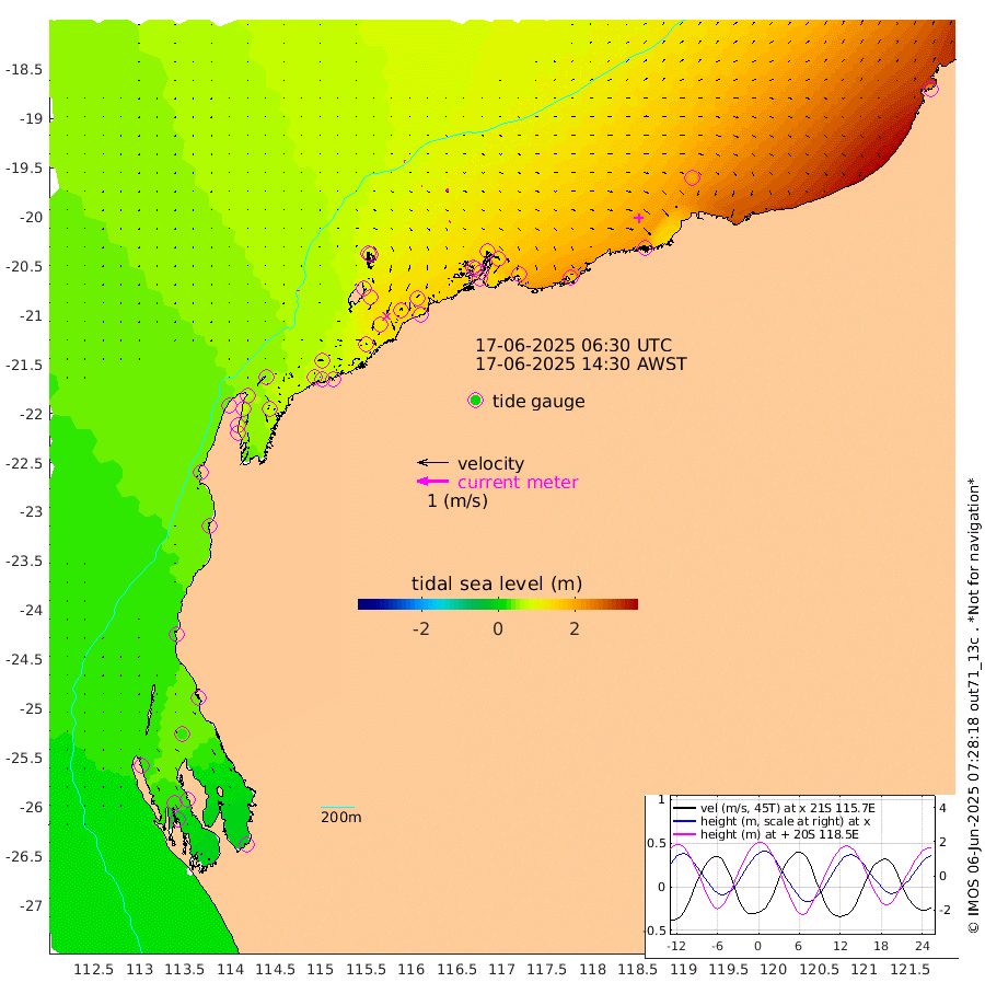 3cm/s -12T +12cm/s rms + 5cm/s -173T. NWSBAR 206m 0cm/s 29T +22cm/s rms + 10cm/s -148T. TAN100 109m 3cm/s 93T +11cm/s rms + 8cm/s -129T. PIL200 208m 2cm/s 71T +13cm/s rms + 7cm/s -137T. PIL100 105m 3cm/s 55T +12cm/s rms + 2cm/s -92T. PIL050 55m 1cm/s -108T +18cm/s rms + 4cm/s -149T. NRSNIN 61m 8cm/s 25T +6cm/s rms + 3cm/s 112T. NW Shelf M6 65m 30cm Withnell Point 27cm Denham 25cm Shark Bay (Inr Bn) 30cm Shark Bay 20cm Useless Loop -7cm Hamelin Pool 44cm Carnarvon 33cm Cape Cuvier 36cm Coral Bay 37cm Norwegian Bay 84cm Badjirrajirra 43cm Tantabiddi 63cm Point Murat 74cm Exmouth 79cm Learmonth 74cm Y Island 55cm North Muiron Island 64cm Roller 67cm Ashburton North 74cm Onslow (Beadon Creek) 71cm Thevenard Island 108cm Large Island 120cm North Sandy Island 96cm Barrow Island (Wapet Landing) 122cm Barrow Island (Tanker Mooring) 131cm Withnell Bay 82cm Trimouille Island 81cm North West Island 121cm Fortescue Road 134cm Steamboat Island 128cm Sholl Island 129cm Fairway Beacon 133cm Mawby Island 131cm Dampier (King Bay) 130cm Cape Legendre 143cm Hauy Island 160cm Port Walcott (Cape Lambert) 172cm Depuch Island 196cm Port Hedland 192cm Bedout Island 245cm Lagrange Bay