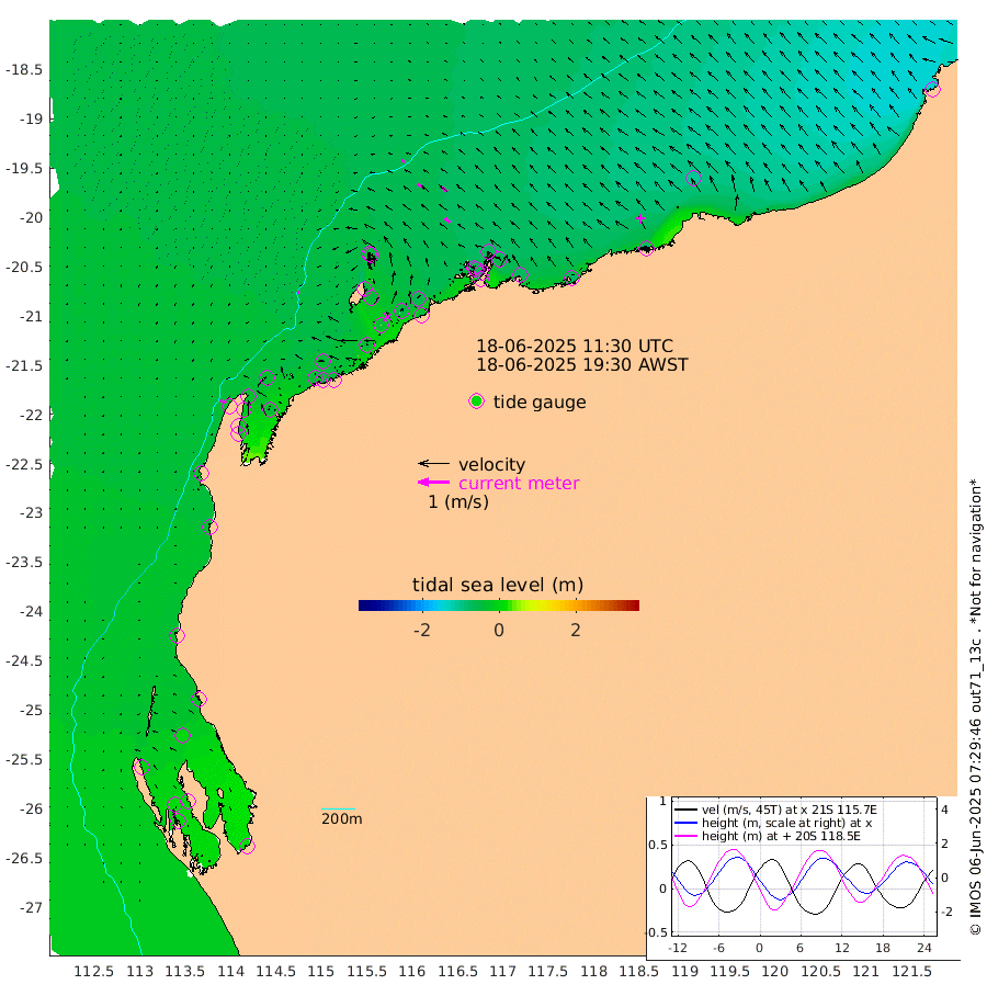 6cm/s -116T +12cm/s rms + 5cm/s -173T. NWSBAR 206m 9cm/s -141T +22cm/s rms + 10cm/s -148T. TAN100 109m 11cm/s -70T +11cm/s rms + 8cm/s -129T. PIL200 208m 18cm/s -55T +13cm/s rms + 7cm/s -137T. PIL100 105m 22cm/s -54T +12cm/s rms + 2cm/s -92T. PIL050 55m 8cm/s -134T +18cm/s rms + 4cm/s -149T. NRSNIN 61m 22cm/s -58T +6cm/s rms + 3cm/s 112T. NW Shelf M6 65m -9cm Withnell Point 5cm Denham 5cm Shark Bay (Inr Bn) 3cm Shark Bay 8cm Useless Loop 5cm Hamelin Pool -24cm Carnarvon -30cm Cape Cuvier -32cm Coral Bay -31cm Norwegian Bay -35cm Badjirrajirra -33cm Tantabiddi -32cm Point Murat -32cm Exmouth -31cm Learmonth -39cm Y Island -35cm North Muiron Island -38cm Roller -42cm Ashburton North -42cm Onslow (Beadon Creek) -42cm Thevenard Island -34cm Large Island -43cm North Sandy Island -46cm Barrow Island (Wapet Landing) -40cm Barrow Island (Tanker Mooring) -67cm Withnell Bay -45cm Trimouille Island -38cm North West Island -43cm Fortescue Road -64cm Steamboat Island -49cm Sholl Island -66cm Fairway Beacon -68cm Mawby Island -67cm Dampier (King Bay) -70cm Cape Legendre -57cm Hauy Island -74cm Port Walcott (Cape Lambert) -68cm Depuch Island -90cm Port Hedland -110cm Bedout Island -144cm Lagrange Bay