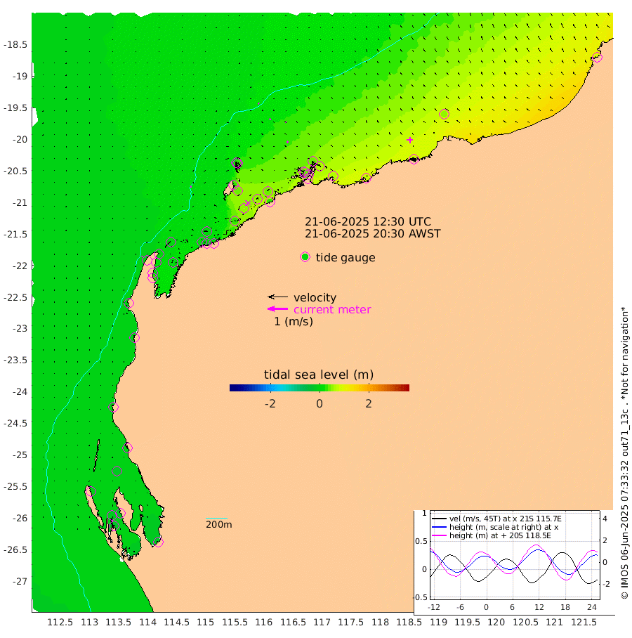6cm/s -72T +12cm/s rms + 5cm/s -173T. NWSBAR 206m 2cm/s -152T +22cm/s rms + 10cm/s -148T. TAN100 109m 4cm/s -64T +11cm/s rms + 8cm/s -129T. PIL200 208m 7cm/s -43T +13cm/s rms + 7cm/s -137T. PIL100 105m 8cm/s -43T +12cm/s rms + 2cm/s -92T. PIL050 55m 2cm/s -127T +18cm/s rms + 4cm/s -149T. NRSNIN 61m 5cm/s -41T +6cm/s rms + 3cm/s 112T. NW Shelf M6 65m -5cm Withnell Point -15cm Denham -16cm Shark Bay (Inr Bn) -15cm Shark Bay -24cm Useless Loop -13cm Hamelin Pool 1cm Carnarvon -4cm Cape Cuvier -5cm Coral Bay -2cm Norwegian Bay 20cm Badjirrajirra -1cm Tantabiddi 9cm Point Murat 15cm Exmouth 25cm Learmonth 10cm Y Island 3cm North Muiron Island 10cm Roller 10cm Ashburton North 13cm Onslow (Beadon Creek) 11cm Thevenard Island 23cm Large Island 48cm North Sandy Island 26cm Barrow Island (Wapet Landing) 44cm Barrow Island (Tanker Mooring) 40cm Withnell Bay 24cm Trimouille Island 18cm North West Island 33cm Fortescue Road 36cm Steamboat Island 46cm Sholl Island 40cm Fairway Beacon 42cm Mawby Island 40cm Dampier (King Bay) 44cm Cape Legendre 57cm Hauy Island 57cm Port Walcott (Cape Lambert) 69cm Depuch Island 73cm Port Hedland 50cm Bedout Island 90cm Lagrange Bay