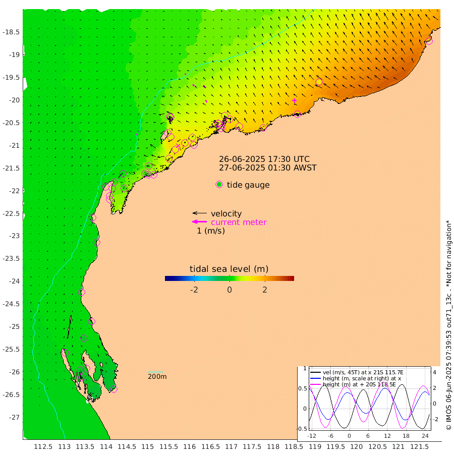 8cm/s -92T +12cm/s rms + 5cm/s -173T. NWSBAR 206m 2cm/s -137T +22cm/s rms + 10cm/s -148T. TAN100 109m 9cm/s -72T +11cm/s rms + 8cm/s -129T. PIL200 208m 15cm/s -48T +13cm/s rms + 7cm/s -137T. PIL100 105m 18cm/s -39T +12cm/s rms + 2cm/s -92T. PIL050 55m 1cm/s -100T +18cm/s rms + 4cm/s -149T. NRSNIN 61m 23cm/s -48T +6cm/s rms + 3cm/s 112T. NW Shelf M6 65m 2cm Withnell Point -11cm Denham -14cm Shark Bay (Inr Bn) -15cm Shark Bay -27cm Useless Loop -21cm Hamelin Pool 18cm Carnarvon 6cm Cape Cuvier 5cm Coral Bay 9cm Norwegian Bay 54cm Badjirrajirra 11cm Tantabiddi 33cm Point Murat 44cm Exmouth 57cm Learmonth 34cm Y Island 20cm North Muiron Island 25cm Roller 32cm Ashburton North 39cm Onslow (Beadon Creek) 33cm Thevenard Island 104cm Large Island 104cm North Sandy Island 61cm Barrow Island (Wapet Landing) 101cm Barrow Island (Tanker Mooring) 84cm Withnell Bay 71cm Trimouille Island 38cm North West Island 115cm Fortescue Road 87cm Steamboat Island 103cm Sholl Island 84cm Fairway Beacon 82cm Mawby Island 85cm Dampier (King Bay) 85cm Cape Legendre 108cm Hauy Island 116cm Port Walcott (Cape Lambert) 138cm Depuch Island 144cm Port Hedland 115cm Bedout Island 158cm Lagrange Bay