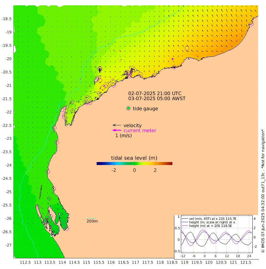 6cm/s -93T +12cm/s rms + 5cm/s -173T. NWSBAR 206m 1cm/s -134T +22cm/s rms + 10cm/s -148T. TAN100 109m 6cm/s -68T +11cm/s rms + 8cm/s -129T. PIL200 208m 9cm/s -35T +13cm/s rms + 7cm/s -137T. PIL100 105m 10cm/s -25T +12cm/s rms + 2cm/s -92T. PIL050 55m 1cm/s -101T +18cm/s rms + 4cm/s -149T. NRSNIN 61m 16cm/s -36T +6cm/s rms + 3cm/s 112T. NW Shelf M6 65m 27cm Withnell Point 24cm Denham 20cm Shark Bay (Inr Bn) 20cm Shark Bay 13cm Useless Loop -13cm Hamelin Pool 39cm Carnarvon 26cm Cape Cuvier 27cm Coral Bay 32cm Norwegian Bay 67cm Badjirrajirra 30cm Tantabiddi 49cm Point Murat 59cm Exmouth 67cm Learmonth 52cm Y Island 39cm North Muiron Island 42cm Roller 49cm Ashburton North 54cm Onslow (Beadon Creek) 50cm Thevenard Island 70cm Large Island 96cm North Sandy Island 71cm Barrow Island (Wapet Landing) 95cm Barrow Island (Tanker Mooring) 88cm Withnell Bay 66cm Trimouille Island 52cm North West Island 83cm Fortescue Road 83cm Steamboat Island 97cm Sholl Island 87cm Fairway Beacon 87cm Mawby Island 88cm Dampier (King Bay) 93cm Cape Legendre 97cm Hauy Island 110cm Port Walcott (Cape Lambert) 113cm Depuch Island 130cm Port Hedland 107cm Bedout Island 83cm Lagrange Bay