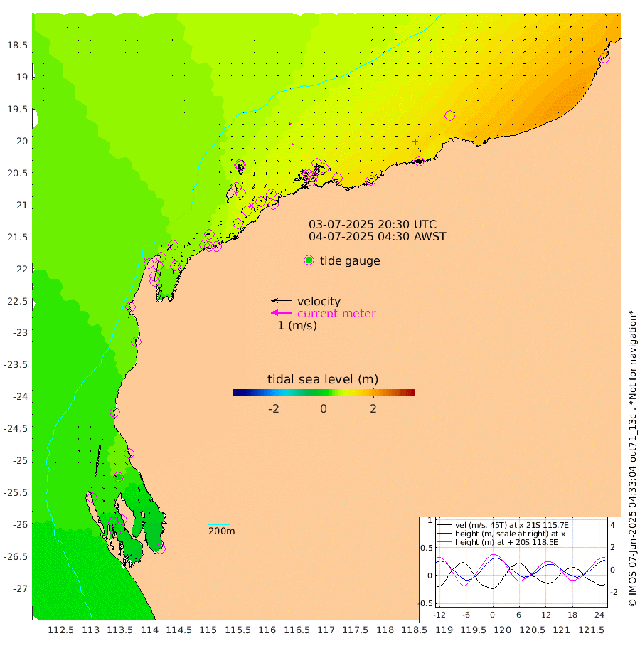 2cm/s -71T +12cm/s rms + 5cm/s -173T. NWSBAR 206m 2cm/s 36T +22cm/s rms + 10cm/s -148T. TAN100 109m 1cm/s 52T +11cm/s rms + 8cm/s -129T. PIL200 208m 3cm/s 70T +13cm/s rms + 7cm/s -137T. PIL100 105m 5cm/s 69T +12cm/s rms + 2cm/s -92T. PIL050 55m 3cm/s 42T +18cm/s rms + 4cm/s -149T. NRSNIN 61m 6cm/s 7T +6cm/s rms + 3cm/s 112T. NW Shelf M6 65m 28cm Withnell Point 20cm Denham 18cm Shark Bay (Inr Bn) 17cm Shark Bay 10cm Useless Loop -14cm Hamelin Pool 43cm Carnarvon 35cm Cape Cuvier 37cm Coral Bay 41cm Norwegian Bay 67cm Badjirrajirra 40cm Tantabiddi 53cm Point Murat 61cm Exmouth 68cm Learmonth 60cm Y Island 48cm North Muiron Island 53cm Roller 57cm Ashburton North 60cm Onslow (Beadon Creek) 58cm Thevenard Island 78cm Large Island 94cm North Sandy Island 75cm Barrow Island (Wapet Landing) 90cm Barrow Island (Tanker Mooring) 97cm Withnell Bay 71cm Trimouille Island 58cm North West Island 91cm Fortescue Road 87cm Steamboat Island 96cm Sholl Island 95cm Fairway Beacon 97cm Mawby Island 96cm Dampier (King Bay) 99cm Cape Legendre 98cm Hauy Island 115cm Port Walcott (Cape Lambert) 119cm Depuch Island 137cm Port Hedland 121cm Bedout Island 145cm Lagrange Bay