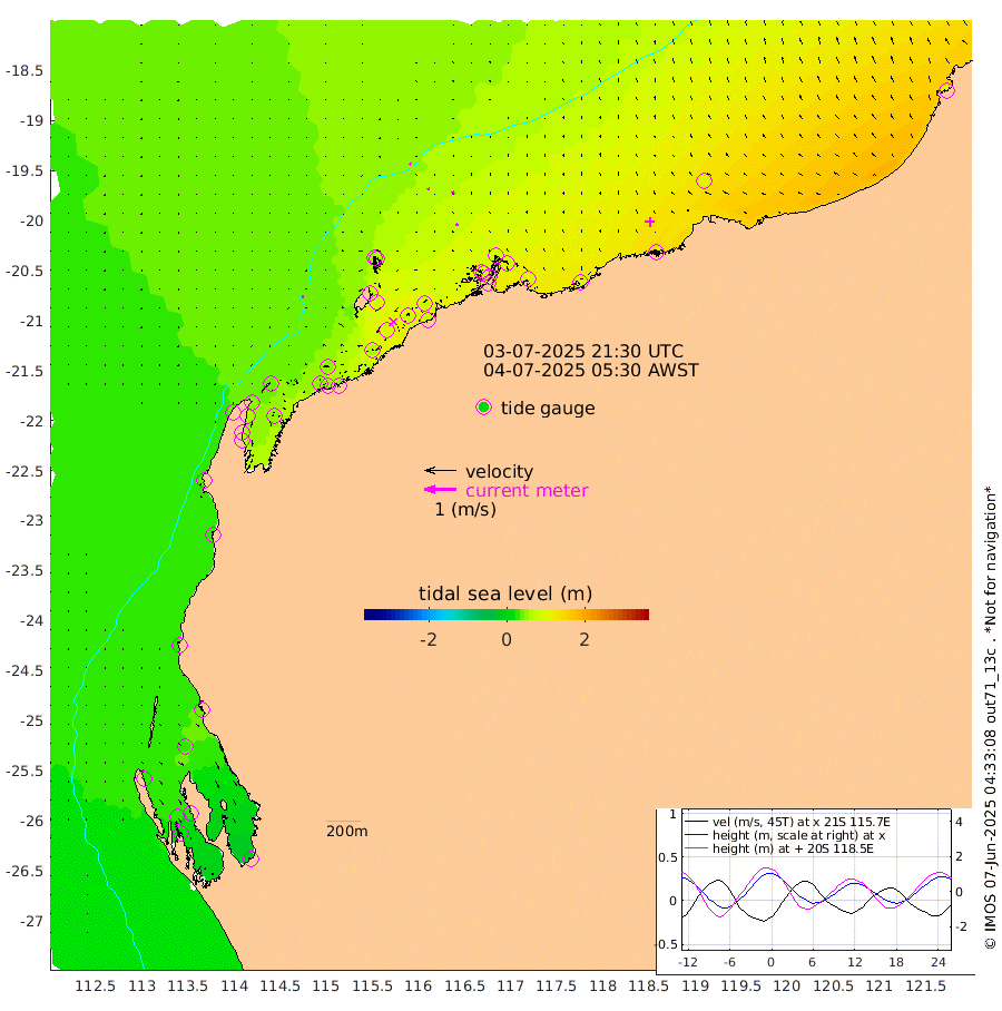 5cm/s -91T +12cm/s rms + 5cm/s -173T. NWSBAR 206m 0cm/s -82T +22cm/s rms + 10cm/s -148T. TAN100 109m 4cm/s -65T +11cm/s rms + 8cm/s -129T. PIL200 208m 6cm/s -27T +13cm/s rms + 7cm/s -137T. PIL100 105m 7cm/s -14T +12cm/s rms + 2cm/s -92T. PIL050 55m 0cm/s 1T +18cm/s rms + 4cm/s -149T. NRSNIN 61m 10cm/s -29T +6cm/s rms + 3cm/s 112T. NW Shelf M6 65m 30cm Withnell Point 28cm Denham 25cm Shark Bay (Inr Bn) 26cm Shark Bay 19cm Useless Loop -12cm Hamelin Pool 42cm Carnarvon 30cm Cape Cuvier 31cm Coral Bay 35cm Norwegian Bay 65cm Badjirrajirra 34cm Tantabiddi 49cm Point Murat 58cm Exmouth 64cm Learmonth 53cm Y Island 41cm North Muiron Island 45cm Roller 50cm Ashburton North 54cm Onslow (Beadon Creek) 51cm Thevenard Island 64cm Large Island 89cm North Sandy Island 68cm Barrow Island (Wapet Landing) 87cm Barrow Island (Tanker Mooring) 83cm Withnell Bay 62cm Trimouille Island 51cm North West Island 77cm Fortescue Road 75cm Steamboat Island 87cm Sholl Island 82cm Fairway Beacon 83cm Mawby Island 84cm Dampier (King Bay) 88cm Cape Legendre 88cm Hauy Island 101cm Port Walcott (Cape Lambert) 103cm Depuch Island 119cm Port Hedland 100cm Bedout Island 91cm Lagrange Bay