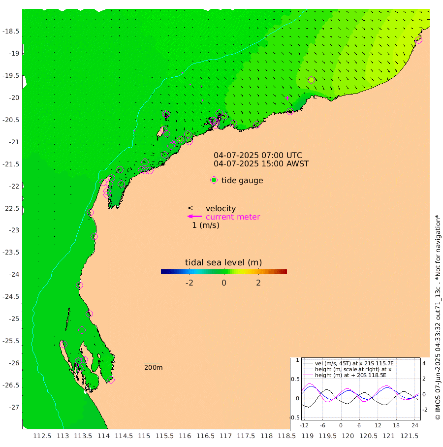 5cm/s 56T +12cm/s rms + 5cm/s -173T. NWSBAR 206m 1cm/s 56T +22cm/s rms + 10cm/s -148T. TAN100 109m 7cm/s 106T +11cm/s rms + 8cm/s -129T. PIL200 208m 9cm/s 133T +13cm/s rms + 7cm/s -137T. PIL100 105m 9cm/s 138T +12cm/s rms + 2cm/s -92T. PIL050 55m 1cm/s 66T +18cm/s rms + 4cm/s -149T. NRSNIN 61m 6cm/s 106T +6cm/s rms + 3cm/s 112T. NW Shelf M6 65m -13cm Withnell Point -14cm Denham -13cm Shark Bay (Inr Bn) -11cm Shark Bay -10cm Useless Loop 5cm Hamelin Pool -11cm Carnarvon -6cm Cape Cuvier -4cm Coral Bay -4cm Norwegian Bay 1cm Badjirrajirra -1cm Tantabiddi -1cm Point Murat 0cm Exmouth -2cm Learmonth 8cm Y Island 2cm North Muiron Island 5cm Roller 4cm Ashburton North 4cm Onslow (Beadon Creek) 5cm Thevenard Island 14cm Large Island 8cm North Sandy Island 8cm Barrow Island (Wapet Landing) 7cm Barrow Island (Tanker Mooring) 23cm Withnell Bay 0cm Trimouille Island 8cm North West Island 23cm Fortescue Road 26cm Steamboat Island 25cm Sholl Island 21cm Fairway Beacon 22cm Mawby Island 22cm Dampier (King Bay) 13cm Cape Legendre 23cm Hauy Island 28cm Port Walcott (Cape Lambert) 33cm Depuch Island 41cm Port Hedland 59cm Bedout Island 78cm Lagrange Bay