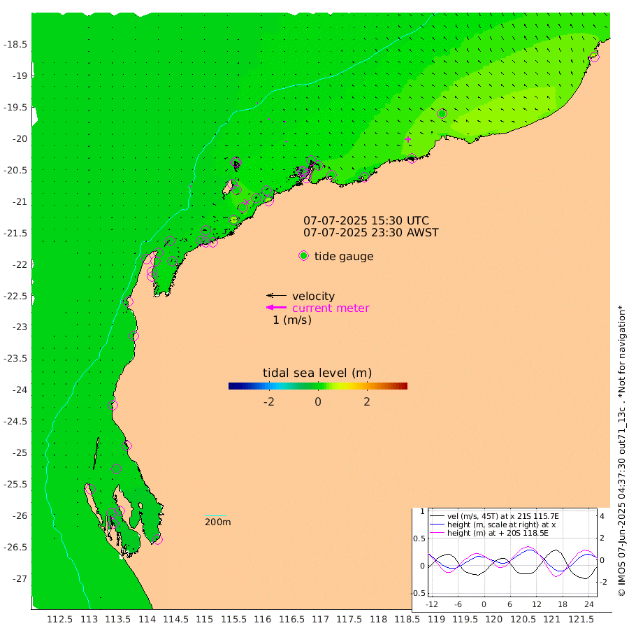 3cm/s -104T +12cm/s rms + 5cm/s -173T. NWSBAR 206m 0cm/s 56T +22cm/s rms + 10cm/s -148T. TAN100 109m 4cm/s -76T +11cm/s rms + 8cm/s -129T. PIL200 208m 5cm/s -50T +13cm/s rms + 7cm/s -137T. PIL100 105m 6cm/s -46T +12cm/s rms + 2cm/s -92T. PIL050 55m 1cm/s 4T +18cm/s rms + 4cm/s -149T. NRSNIN 61m 5cm/s -62T +6cm/s rms + 3cm/s 112T. NW Shelf M6 65m -6cm Withnell Point -16cm Denham -18cm Shark Bay (Inr Bn) -19cm Shark Bay -24cm Useless Loop -13cm Hamelin Pool -1cm Carnarvon -1cm Cape Cuvier -3cm Coral Bay -2cm Norwegian Bay 4cm Badjirrajirra -2cm Tantabiddi 1cm Point Murat 2cm Exmouth 10cm Learmonth -4cm Y Island -2cm North Muiron Island -3cm Roller 1cm Ashburton North 2cm Onslow (Beadon Creek) 1cm Thevenard Island 47cm Large Island 19cm North Sandy Island 7cm Barrow Island (Wapet Landing) 17cm Barrow Island (Tanker Mooring) 9cm Withnell Bay 16cm Trimouille Island 6cm North West Island 46cm Fortescue Road 13cm Steamboat Island 12cm Sholl Island 10cm Fairway Beacon 9cm Mawby Island 11cm Dampier (King Bay) 10cm Cape Legendre 19cm Hauy Island 18cm Port Walcott (Cape Lambert) 28cm Depuch Island 22cm Port Hedland 5cm Bedout Island 69cm Lagrange Bay