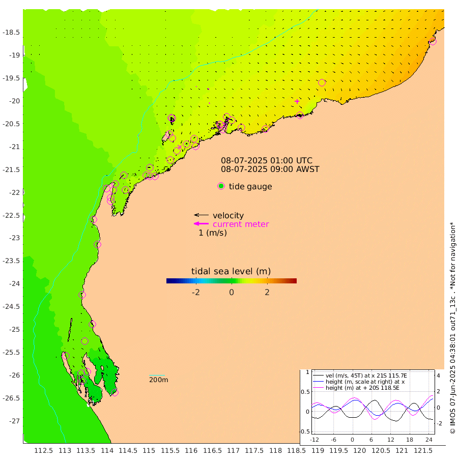 2cm/s -77T +12cm/s rms + 5cm/s -173T. NWSBAR 206m 1cm/s 33T +22cm/s rms + 10cm/s -148T. TAN100 109m 0cm/s -94T +11cm/s rms + 8cm/s -129T. PIL200 208m 2cm/s 50T +13cm/s rms + 7cm/s -137T. PIL100 105m 4cm/s 69T +12cm/s rms + 2cm/s -92T. PIL050 55m 2cm/s 35T +18cm/s rms + 4cm/s -149T. NRSNIN 61m 9cm/s 104T +6cm/s rms + 3cm/s 112T. NW Shelf M6 65m 41cm Withnell Point 44cm Denham 42cm Shark Bay (Inr Bn) 47cm Shark Bay 42cm Useless Loop -3cm Hamelin Pool 46cm Carnarvon 35cm Cape Cuvier 38cm Coral Bay 38cm Norwegian Bay 62cm Badjirrajirra 40cm Tantabiddi 51cm Point Murat 58cm Exmouth 58cm Learmonth 58cm Y Island 47cm North Muiron Island 54cm Roller 55cm Ashburton North 57cm Onslow (Beadon Creek) 57cm Thevenard Island 81cm Large Island 82cm North Sandy Island 70cm Barrow Island (Wapet Landing) 83cm Barrow Island (Tanker Mooring) 86cm Withnell Bay 63cm Trimouille Island 57cm North West Island 99cm Fortescue Road 73cm Steamboat Island 63cm Sholl Island 84cm Fairway Beacon 83cm Mawby Island 86cm Dampier (King Bay) 88cm Cape Legendre 86cm Hauy Island 101cm Port Walcott (Cape Lambert) 108cm Depuch Island 118cm Port Hedland 120cm Bedout Island 232cm Lagrange Bay