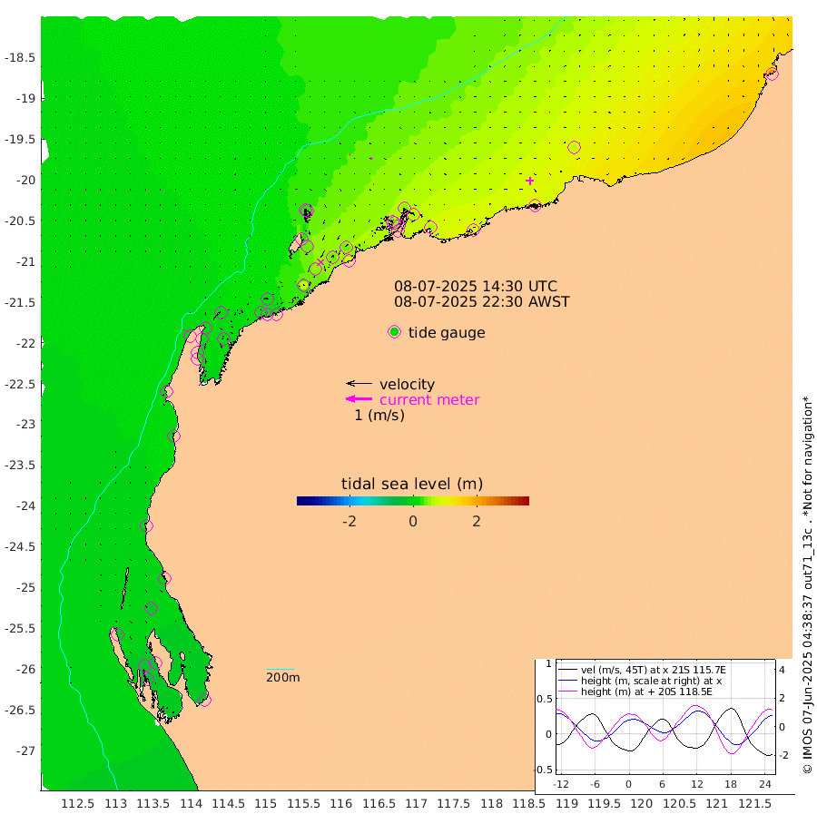3cm/s -56T +12cm/s rms + 5cm/s -173T. NWSBAR 206m 2cm/s 53T +22cm/s rms + 10cm/s -148T. TAN100 109m 1cm/s 116T +11cm/s rms + 8cm/s -129T. PIL200 208m 2cm/s 85T +13cm/s rms + 7cm/s -137T. PIL100 105m 2cm/s 90T +12cm/s rms + 2cm/s -92T. PIL050 55m 3cm/s 39T +18cm/s rms + 4cm/s -149T. NRSNIN 61m 7cm/s 106T +6cm/s rms + 3cm/s 112T. NW Shelf M6 65m -11cm Withnell Point -27cm Denham -29cm Shark Bay (Inr Bn) -29cm Shark Bay -37cm Useless Loop -15cm Hamelin Pool 0cm Carnarvon 0cm Cape Cuvier 0cm Coral Bay 3cm Norwegian Bay 18cm Badjirrajirra 4cm Tantabiddi 10cm Point Murat 14cm Exmouth 25cm Learmonth 12cm Y Island 8cm North Muiron Island 13cm Roller 16cm Ashburton North 17cm Onslow (Beadon Creek) 16cm Thevenard Island 72cm Large Island 48cm North Sandy Island 30cm Barrow Island (Wapet Landing) 43cm Barrow Island (Tanker Mooring) 48cm Withnell Bay 30cm Trimouille Island 23cm North West Island 91cm Fortescue Road 43cm Steamboat Island 41cm Sholl Island 48cm Fairway Beacon 49cm Mawby Island 50cm Dampier (King Bay) 48cm Cape Legendre 61cm Hauy Island 66cm Port Walcott (Cape Lambert) 83cm Depuch Island 86cm Port Hedland 68cm Bedout Island 225cm Lagrange Bay