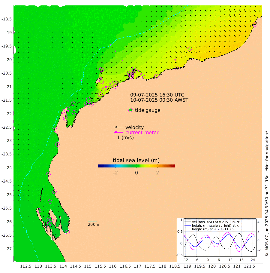 5cm/s -100T +12cm/s rms + 5cm/s -173T. NWSBAR 206m 0cm/s 28T +22cm/s rms + 10cm/s -148T. TAN100 109m 5cm/s -75T +11cm/s rms + 8cm/s -129T. PIL200 208m 8cm/s -47T +13cm/s rms + 7cm/s -137T. PIL100 105m 9cm/s -38T +12cm/s rms + 2cm/s -92T. PIL050 55m 1cm/s 4T +18cm/s rms + 4cm/s -149T. NRSNIN 61m 11cm/s -39T +6cm/s rms + 3cm/s 112T. NW Shelf M6 65m -1cm Withnell Point -12cm Denham -16cm Shark Bay (Inr Bn) -16cm Shark Bay -25cm Useless Loop -18cm Hamelin Pool 11cm Carnarvon 5cm Cape Cuvier 5cm Coral Bay 6cm Norwegian Bay 29cm Badjirrajirra 8cm Tantabiddi 18cm Point Murat 24cm Exmouth 35cm Learmonth 16cm Y Island 12cm North Muiron Island 14cm Roller 19cm Ashburton North 22cm Onslow (Beadon Creek) 19cm Thevenard Island 87cm Large Island 61cm North Sandy Island 35cm Barrow Island (Wapet Landing) 57cm Barrow Island (Tanker Mooring) 47cm Withnell Bay 38cm Trimouille Island 27cm North West Island 95cm Fortescue Road 50cm Steamboat Island 53cm Sholl Island 48cm Fairway Beacon 48cm Mawby Island 49cm Dampier (King Bay) 45cm Cape Legendre 62cm Hauy Island 66cm Port Walcott (Cape Lambert) 85cm Depuch Island 83cm Port Hedland 57cm Bedout Island 144cm Lagrange Bay