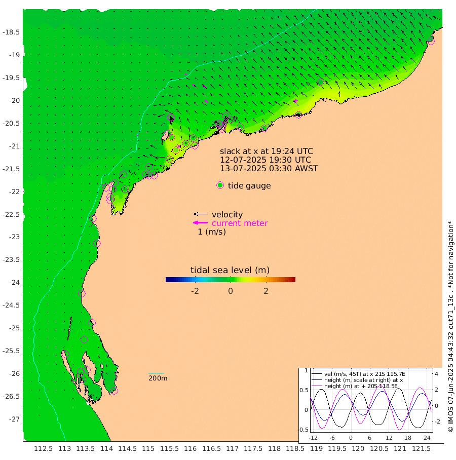 8cm/s -126T +12cm/s rms + 5cm/s -173T. NWSBAR 206m 4cm/s -135T +22cm/s rms + 10cm/s -148T. TAN100 109m 15cm/s -73T +11cm/s rms + 8cm/s -129T. PIL200 208m 23cm/s -53T +13cm/s rms + 7cm/s -137T. PIL100 105m 27cm/s -49T +12cm/s rms + 2cm/s -92T. PIL050 55m 4cm/s -121T +18cm/s rms + 4cm/s -149T. NRSNIN 61m 34cm/s -52T +6cm/s rms + 3cm/s 112T. NW Shelf M6 65m 5cm Withnell Point 7cm Denham 2cm Shark Bay (Inr Bn) 2cm Shark Bay -4cm Useless Loop -14cm Hamelin Pool 9cm Carnarvon -3cm Cape Cuvier -5cm Coral Bay -4cm Norwegian Bay 16cm Badjirrajirra -5cm Tantabiddi 7cm Point Murat 12cm Exmouth 17cm Learmonth 1cm Y Island -3cm North Muiron Island -5cm Roller -2cm Ashburton North 1cm Onslow (Beadon Creek) -3cm Thevenard Island 39cm Large Island 35cm North Sandy Island 7cm Barrow Island (Wapet Landing) 32cm Barrow Island (Tanker Mooring) -3cm Withnell Bay 9cm Trimouille Island -1cm North West Island 36cm Fortescue Road 3cm Steamboat Island 28cm Sholl Island 0cm Fairway Beacon -2cm Mawby Island -2cm Dampier (King Bay) -7cm Cape Legendre 11cm Hauy Island 6cm Port Walcott (Cape Lambert) 15cm Depuch Island 4cm Port Hedland -25cm Bedout Island -87cm Lagrange Bay