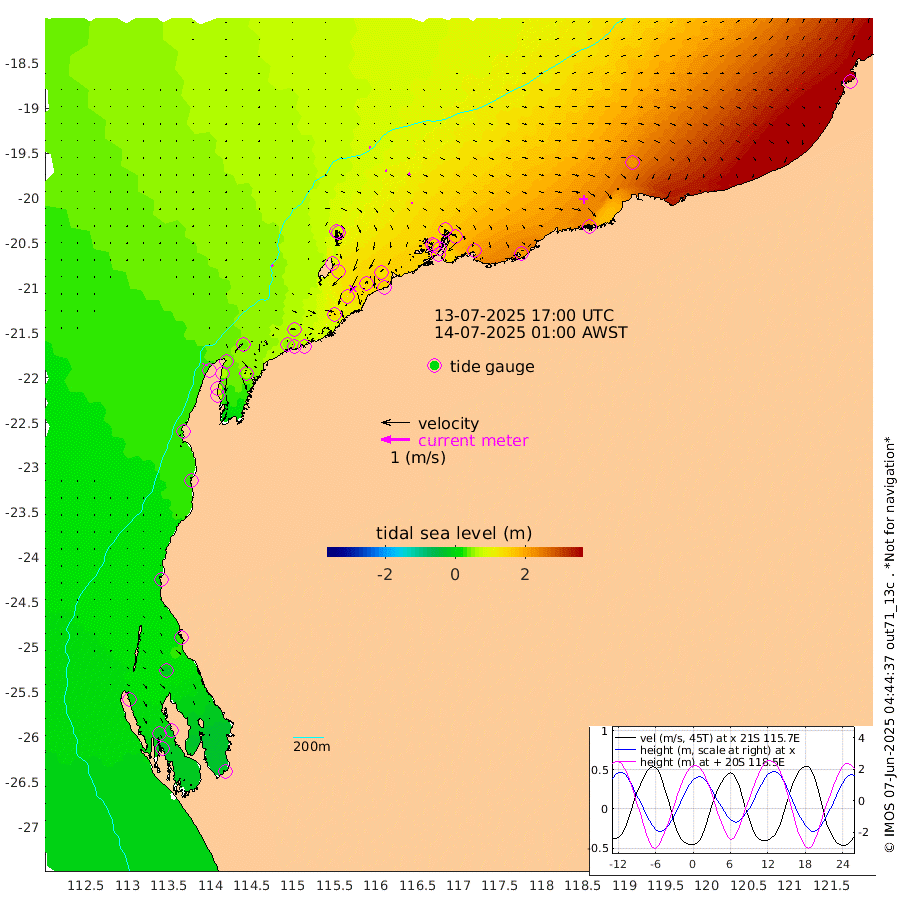 4cm/s -48T +12cm/s rms + 5cm/s -173T. NWSBAR 206m 4cm/s 41T +22cm/s rms + 10cm/s -148T. TAN100 109m 4cm/s 98T +11cm/s rms + 8cm/s -129T. PIL200 208m 5cm/s 97T +13cm/s rms + 7cm/s -137T. PIL100 105m 7cm/s 90T +12cm/s rms + 2cm/s -92T. PIL050 55m 5cm/s 43T +18cm/s rms + 4cm/s -149T. NRSNIN 61m 6cm/s 61T +6cm/s rms + 3cm/s 112T. NW Shelf M6 65m 4cm Withnell Point -16cm Denham -17cm Shark Bay (Inr Bn) -19cm Shark Bay -30cm Useless Loop -19cm Hamelin Pool 27cm Carnarvon 21cm Cape Cuvier 23cm Coral Bay 28cm Norwegian Bay 73cm Badjirrajirra 32cm Tantabiddi 51cm Point Murat 63cm Exmouth 79cm Learmonth 63cm Y Island 45cm North Muiron Island 56cm Roller 62cm Ashburton North 68cm Onslow (Beadon Creek) 64cm Thevenard Island 129cm Large Island 135cm North Sandy Island 95cm Barrow Island (Wapet Landing) 125cm Barrow Island (Tanker Mooring) 143cm Withnell Bay 98cm Trimouille Island 69cm North West Island 157cm Fortescue Road 132cm Steamboat Island 135cm Sholl Island 140cm Fairway Beacon 142cm Mawby Island 143cm Dampier (King Bay) 143cm Cape Legendre 158cm Hauy Island 181cm Port Walcott (Cape Lambert) 209cm Depuch Island 229cm Port Hedland 215cm Bedout Island 355cm Lagrange Bay