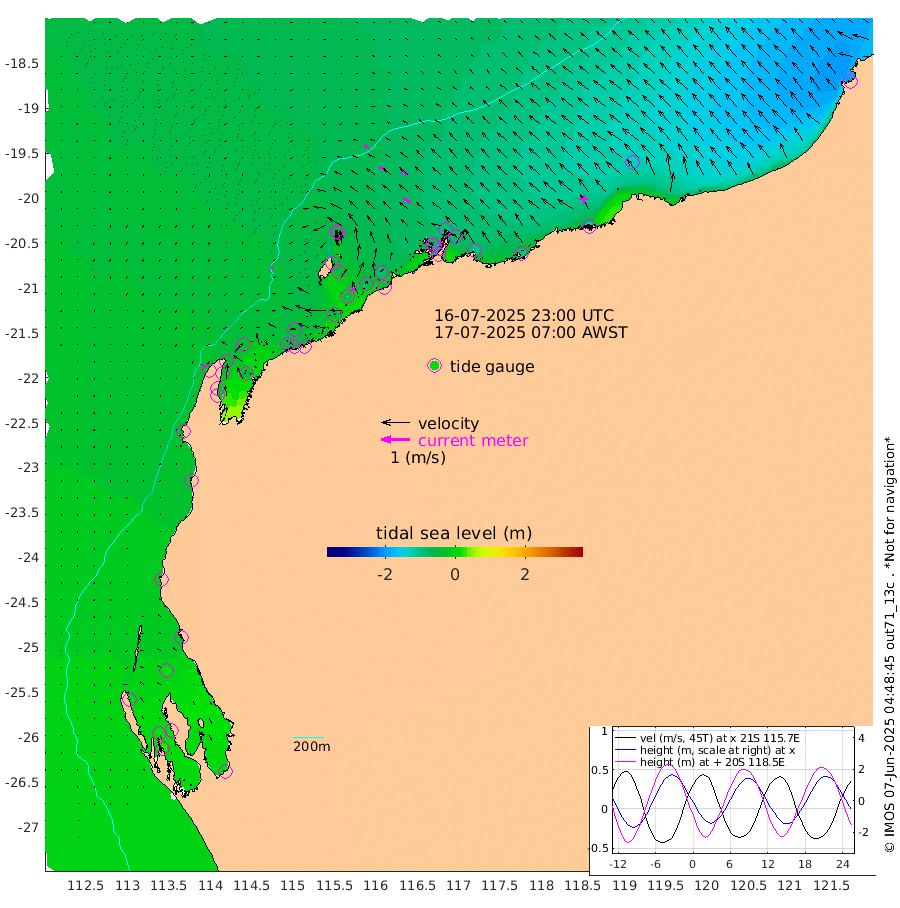8cm/s -134T +12cm/s rms + 5cm/s -173T. NWSBAR 206m 7cm/s -137T +22cm/s rms + 10cm/s -148T. TAN100 109m 17cm/s -75T +11cm/s rms + 8cm/s -129T. PIL200 208m 25cm/s -56T +13cm/s rms + 7cm/s -137T. PIL100 105m 29cm/s -53T +12cm/s rms + 2cm/s -92T. PIL050 55m 6cm/s -130T +18cm/s rms + 4cm/s -149T. NRSNIN 61m 26cm/s -60T +6cm/s rms + 3cm/s 112T. NW Shelf M6 65m 2cm Withnell Point 20cm Denham 17cm Shark Bay (Inr Bn) 19cm Shark Bay 23cm Useless Loop 6cm Hamelin Pool -12cm Carnarvon -22cm Cape Cuvier -25cm Coral Bay -24cm Norwegian Bay -32cm Badjirrajirra -29cm Tantabiddi -28cm Point Murat -29cm Exmouth -38cm Learmonth -36cm Y Island -33cm North Muiron Island -38cm Roller -41cm Ashburton North -42cm Onslow (Beadon Creek) -42cm Thevenard Island -41cm Large Island -48cm North Sandy Island -52cm Barrow Island (Wapet Landing) -44cm Barrow Island (Tanker Mooring) -85cm Withnell Bay -49cm Trimouille Island -50cm North West Island -45cm Fortescue Road -82cm Steamboat Island -66cm Sholl Island -82cm Fairway Beacon -88cm Mawby Island -85cm Dampier (King Bay) -86cm Cape Legendre -81cm Hauy Island -98cm Port Walcott (Cape Lambert) -100cm Depuch Island -126cm Port Hedland -133cm Bedout Island -192cm Lagrange Bay