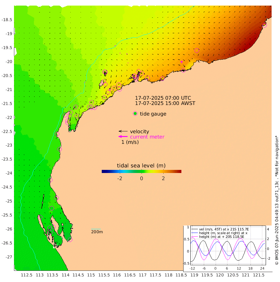 4cm/s -12T +12cm/s rms + 5cm/s -173T. NWSBAR 206m 0cm/s 102T +22cm/s rms + 10cm/s -148T. TAN100 109m 4cm/s 91T +11cm/s rms + 8cm/s -129T. PIL200 208m 3cm/s 95T +13cm/s rms + 7cm/s -137T. PIL100 105m 3cm/s 76T +12cm/s rms + 2cm/s -92T. PIL050 55m 0cm/s -132T +18cm/s rms + 4cm/s -149T. NRSNIN 61m 7cm/s 2T +6cm/s rms + 3cm/s 112T. NW Shelf M6 65m 13cm Withnell Point 2cm Denham 1cm Shark Bay (Inr Bn) 5cm Shark Bay -7cm Useless Loop -10cm Hamelin Pool 29cm Carnarvon 22cm Cape Cuvier 24cm Coral Bay 27cm Norwegian Bay 76cm Badjirrajirra 32cm Tantabiddi 53cm Point Murat 65cm Exmouth 75cm Learmonth 64cm Y Island 45cm North Muiron Island 56cm Roller 60cm Ashburton North 67cm Onslow (Beadon Creek) 63cm Thevenard Island 79cm Large Island 122cm North Sandy Island 92cm Barrow Island (Wapet Landing) 119cm Barrow Island (Tanker Mooring) 134cm Withnell Bay 81cm Trimouille Island 73cm North West Island 94cm Fortescue Road 132cm Steamboat Island 141cm Sholl Island 131cm Fairway Beacon 136cm Mawby Island 134cm Dampier (King Bay) 133cm Cape Legendre 148cm Hauy Island 168cm Port Walcott (Cape Lambert) 176cm Depuch Island 210cm Port Hedland 204cm Bedout Island 193cm Lagrange Bay