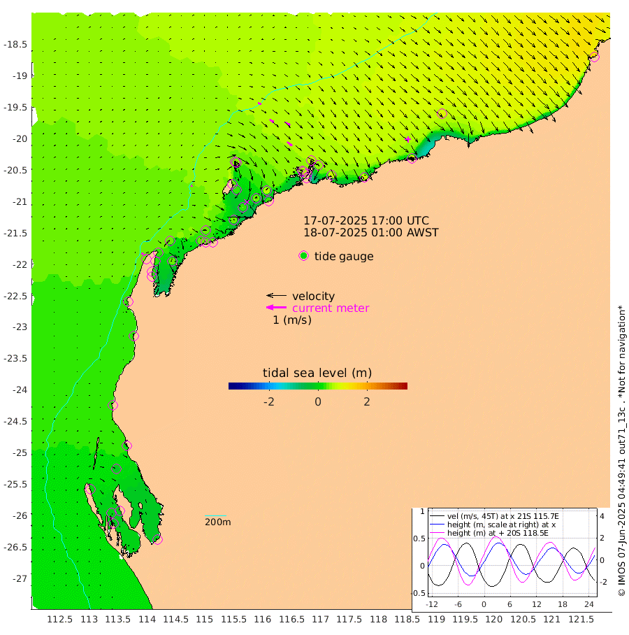 7cm/s 68T +12cm/s rms + 5cm/s -173T. NWSBAR 206m 10cm/s 40T +22cm/s rms + 10cm/s -148T. TAN100 109m 16cm/s 108T +11cm/s rms + 8cm/s -129T. PIL200 208m 27cm/s 124T +13cm/s rms + 7cm/s -137T. PIL100 105m 32cm/s 126T +12cm/s rms + 2cm/s -92T. PIL050 55m 10cm/s 47T +18cm/s rms + 4cm/s -149T. NRSNIN 61m 29cm/s 123T +6cm/s rms + 3cm/s 112T. NW Shelf M6 65m 6cm Withnell Point -11cm Denham -8cm Shark Bay (Inr Bn) -12cm Shark Bay -13cm Useless Loop -6cm Hamelin Pool 21cm Carnarvon 31cm Cape Cuvier 34cm Coral Bay 33cm Norwegian Bay 27cm Badjirrajirra 35cm Tantabiddi 28cm Point Murat 26cm Exmouth 32cm Learmonth 34cm Y Island 36cm North Muiron Island 37cm Roller 41cm Ashburton North 40cm Onslow (Beadon Creek) 41cm Thevenard Island 36cm Large Island 32cm North Sandy Island 43cm Barrow Island (Wapet Landing) 27cm Barrow Island (Tanker Mooring) 66cm Withnell Bay 48cm Trimouille Island 42cm North West Island 34cm Fortescue Road 63cm Steamboat Island 41cm Sholl Island 63cm Fairway Beacon 66cm Mawby Island 66cm Dampier (King Bay) 70cm Cape Legendre 54cm Hauy Island 70cm Port Walcott (Cape Lambert) 72cm Depuch Island 87cm Port Hedland 96cm Bedout Island 148cm Lagrange Bay