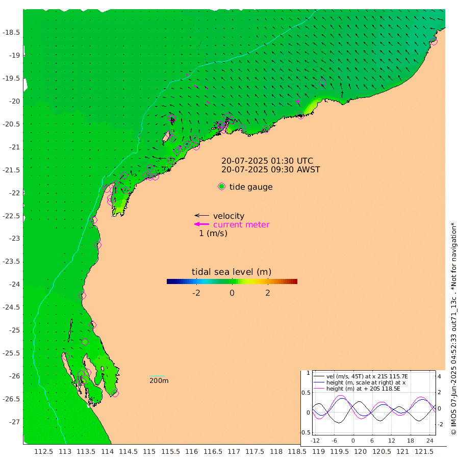 6cm/s -130T +12cm/s rms + 5cm/s -173T. NWSBAR 206m 6cm/s -134T +22cm/s rms + 10cm/s -148T. TAN100 109m 12cm/s -76T +11cm/s rms + 8cm/s -129T. PIL200 208m 19cm/s -55T +13cm/s rms + 7cm/s -137T. PIL100 105m 21cm/s -51T +12cm/s rms + 2cm/s -92T. PIL050 55m 7cm/s -131T +18cm/s rms + 4cm/s -149T. NRSNIN 61m 15cm/s -52T +6cm/s rms + 3cm/s 112T. NW Shelf M6 65m 11cm Withnell Point 34cm Denham 32cm Shark Bay (Inr Bn) 34cm Shark Bay 42cm Useless Loop 14cm Hamelin Pool -5cm Carnarvon -16cm Cape Cuvier -17cm Coral Bay -18cm Norwegian Bay -16cm Badjirrajirra -18cm Tantabiddi -14cm Point Murat -14cm Exmouth -21cm Learmonth -18cm Y Island -18cm North Muiron Island -21cm Roller -23cm Ashburton North -22cm Onslow (Beadon Creek) -23cm Thevenard Island -7cm Large Island -26cm North Sandy Island -27cm Barrow Island (Wapet Landing) -17cm Barrow Island (Tanker Mooring) -44cm Withnell Bay -27cm Trimouille Island -25cm North West Island -2cm Fortescue Road -40cm Steamboat Island -50cm Sholl Island -42cm Fairway Beacon -47cm Mawby Island -44cm Dampier (King Bay) -46cm Cape Legendre -40cm Hauy Island -49cm Port Walcott (Cape Lambert) -40cm Depuch Island -63cm Port Hedland -59cm Bedout Island -34cm Lagrange Bay