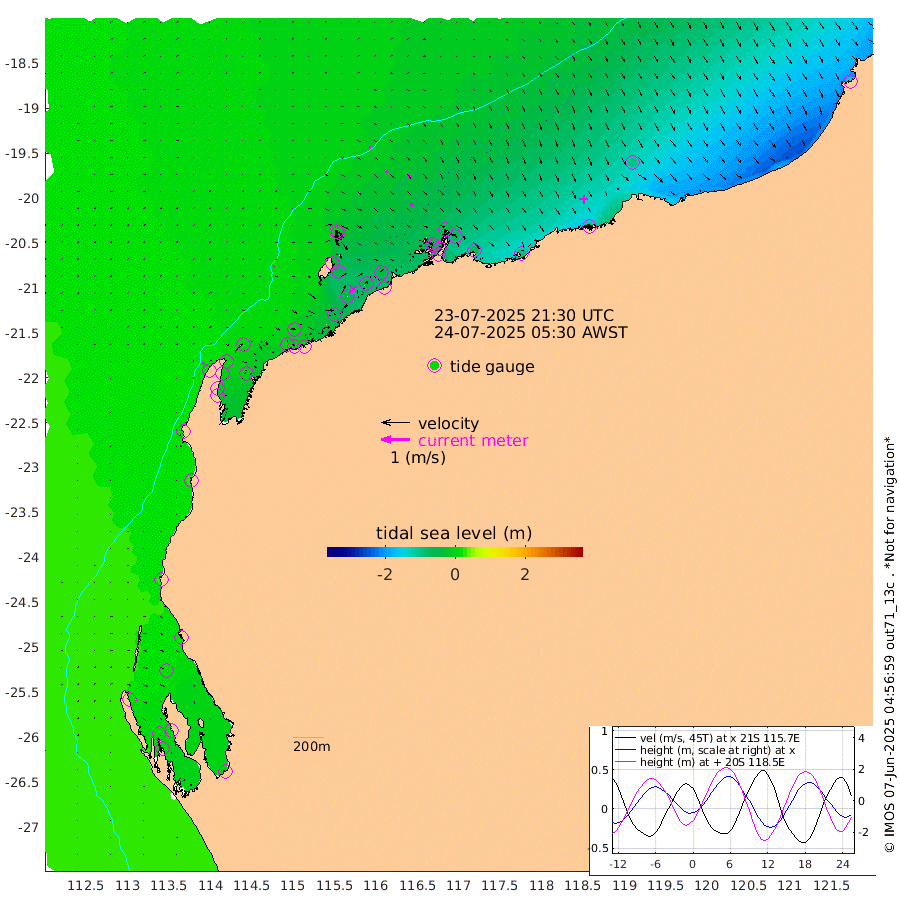 4cm/s 102T +12cm/s rms + 5cm/s -173T. NWSBAR 206m 5cm/s 38T +22cm/s rms + 10cm/s -148T. TAN100 109m 5cm/s 101T +11cm/s rms + 8cm/s -129T. PIL200 208m 10cm/s 131T +13cm/s rms + 7cm/s -137T. PIL100 105m 12cm/s 138T +12cm/s rms + 2cm/s -92T. PIL050 55m 6cm/s 47T +18cm/s rms + 4cm/s -149T. NRSNIN 61m 14cm/s 139T +6cm/s rms + 3cm/s 112T. NW Shelf M6 65m 16cm Withnell Point 12cm Denham 10cm Shark Bay (Inr Bn) 14cm Shark Bay 11cm Useless Loop -5cm Hamelin Pool 18cm Carnarvon 25cm Cape Cuvier 24cm Coral Bay 22cm Norwegian Bay -15cm Badjirrajirra 17cm Tantabiddi 0cm Point Murat -9cm Exmouth -21cm Learmonth -3cm Y Island 9cm North Muiron Island 3cm Roller -1cm Ashburton North -7cm Onslow (Beadon Creek) -2cm Thevenard Island -54cm Large Island -50cm North Sandy Island -25cm Barrow Island (Wapet Landing) -54cm Barrow Island (Tanker Mooring) -50cm Withnell Bay -27cm Trimouille Island -12cm North West Island -75cm Fortescue Road -48cm Steamboat Island -52cm Sholl Island -49cm Fairway Beacon -48cm Mawby Island -50cm Dampier (King Bay) -48cm Cape Legendre -70cm Hauy Island -77cm Port Walcott (Cape Lambert) -97cm Depuch Island -106cm Port Hedland -98cm Bedout Island -166cm Lagrange Bay