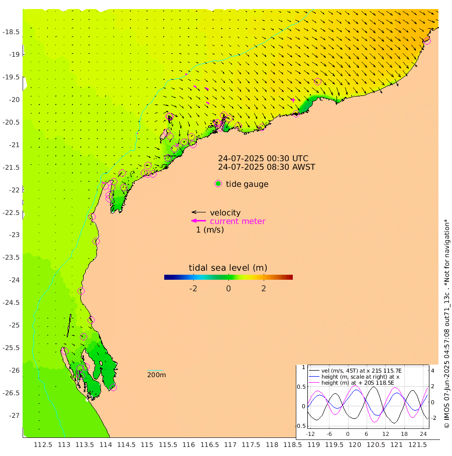6cm/s 60T +12cm/s rms + 5cm/s -173T. NWSBAR 206m 8cm/s 41T +22cm/s rms + 10cm/s -148T. TAN100 109m 11cm/s 108T +11cm/s rms + 8cm/s -129T. PIL200 208m 20cm/s 121T +13cm/s rms + 7cm/s -137T. PIL100 105m 25cm/s 123T +12cm/s rms + 2cm/s -92T. PIL050 55m 8cm/s 44T +18cm/s rms + 4cm/s -149T. NRSNIN 61m 28cm/s 118T +6cm/s rms + 3cm/s 112T. NW Shelf M6 65m 47cm Withnell Point 37cm Denham 34cm Shark Bay (Inr Bn) 42cm Shark Bay 33cm Useless Loop -9cm Hamelin Pool 61cm Carnarvon 58cm Cape Cuvier 61cm Coral Bay 61cm Norwegian Bay 70cm Badjirrajirra 62cm Tantabiddi 65cm Point Murat 67cm Exmouth 65cm Learmonth 71cm Y Island 66cm North Muiron Island 71cm Roller 74cm Ashburton North 74cm Onslow (Beadon Creek) 76cm Thevenard Island 54cm Large Island 74cm North Sandy Island 81cm Barrow Island (Wapet Landing) 76cm Barrow Island (Tanker Mooring) 102cm Withnell Bay 68cm Trimouille Island 76cm North West Island 66cm Fortescue Road 91cm Steamboat Island 66cm Sholl Island 99cm Fairway Beacon 103cm Mawby Island 103cm Dampier (King Bay) 113cm Cape Legendre 91cm Hauy Island 110cm Port Walcott (Cape Lambert) 99cm Depuch Island 124cm Port Hedland 132cm Bedout Island 211cm Lagrange Bay