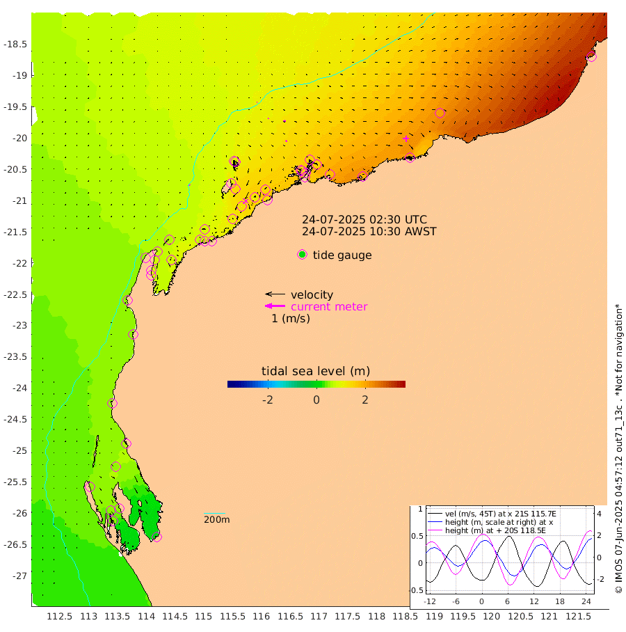 2cm/s -47T +12cm/s rms + 5cm/s -173T. NWSBAR 206m 1cm/s 29T +22cm/s rms + 10cm/s -148T. TAN100 109m 1cm/s 100T +11cm/s rms + 8cm/s -129T. PIL200 208m 4cm/s 58T +13cm/s rms + 7cm/s -137T. PIL100 105m 6cm/s 66T +12cm/s rms + 2cm/s -92T. PIL050 55m 1cm/s 19T +18cm/s rms + 4cm/s -149T. NRSNIN 61m 8cm/s 58T +6cm/s rms + 3cm/s 112T. NW Shelf M6 65m 52cm Withnell Point 53cm Denham 50cm Shark Bay (Inr Bn) 55cm Shark Bay 48cm Useless Loop -5cm Hamelin Pool 62cm Carnarvon 47cm Cape Cuvier 49cm Coral Bay 50cm Norwegian Bay 98cm Badjirrajirra 56cm Tantabiddi 77cm Point Murat 88cm Exmouth 95cm Learmonth 84cm Y Island 67cm North Muiron Island 76cm Roller 82cm Ashburton North 89cm Onslow (Beadon Creek) 85cm Thevenard Island 113cm Large Island 132cm North Sandy Island 111cm Barrow Island (Wapet Landing) 137cm Barrow Island (Tanker Mooring) 146cm Withnell Bay 99cm Trimouille Island 95cm North West Island 132cm Fortescue Road 140cm Steamboat Island 119cm Sholl Island 144cm Fairway Beacon 146cm Mawby Island 147cm Dampier (King Bay) 153cm Cape Legendre 154cm Hauy Island 176cm Port Walcott (Cape Lambert) 187cm Depuch Island 211cm Port Hedland 205cm Bedout Island 292cm Lagrange Bay