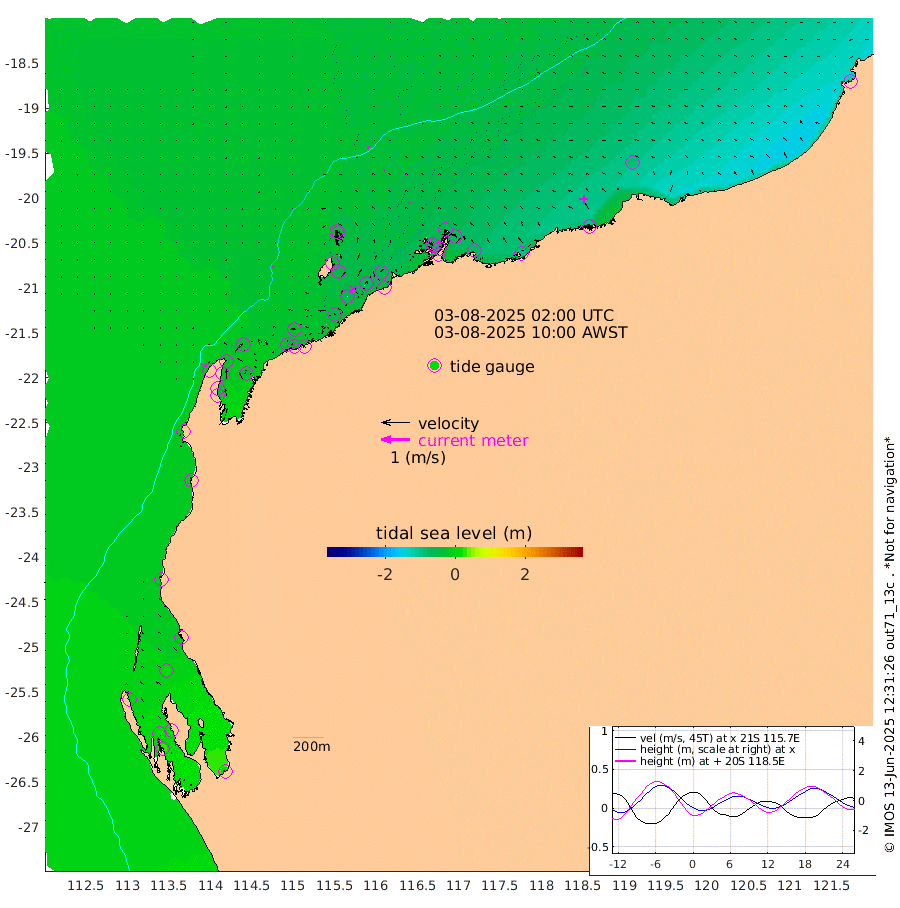 3cm/s 153T +12cm/s rms + 5cm/s -173T. NWSBAR 206m 2cm/s -129T +22cm/s rms + 10cm/s -148T. TAN100 109m 4cm/s -85T +11cm/s rms + 8cm/s -129T. PIL200 208m 6cm/s -66T +13cm/s rms + 7cm/s -137T. PIL100 105m 6cm/s -69T +12cm/s rms + 2cm/s -92T. PIL050 55m 3cm/s -133T +18cm/s rms + 4cm/s -149T. NRSNIN 61m 5cm/s -64T +6cm/s rms + 3cm/s 112T. NW Shelf M6 65m -2cm Withnell Point 15cm Denham 16cm Shark Bay (Inr Bn) 15cm Shark Bay 26cm Useless Loop 17cm Hamelin Pool -17cm Carnarvon -17cm Cape Cuvier -18cm Coral Bay -22cm Norwegian Bay -36cm Badjirrajirra -21cm Tantabiddi -27cm Point Murat -33cm Exmouth -38cm Learmonth -35cm Y Island -27cm North Muiron Island -34cm Roller -32cm Ashburton North -34cm Onslow (Beadon Creek) -33cm Thevenard Island -53cm Large Island -63cm North Sandy Island -45cm Barrow Island (Wapet Landing) -55cm Barrow Island (Tanker Mooring) -65cm Withnell Bay -50cm Trimouille Island -35cm North West Island -55cm Fortescue Road -65cm Steamboat Island -76cm Sholl Island -63cm Fairway Beacon -63cm Mawby Island -64cm Dampier (King Bay) -62cm Cape Legendre -72cm Hauy Island -78cm Port Walcott (Cape Lambert) -90cm Depuch Island -97cm Port Hedland -84cm Bedout Island -120cm Lagrange Bay