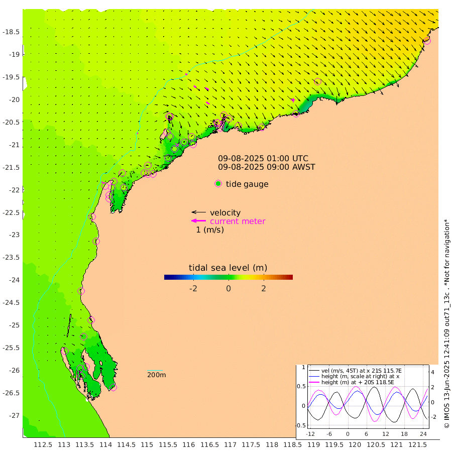 6cm/s 60T +12cm/s rms + 5cm/s -173T. NWSBAR 206m 8cm/s 41T +22cm/s rms + 10cm/s -148T. TAN100 109m 13cm/s 109T +11cm/s rms + 8cm/s -129T. PIL200 208m 21cm/s 125T +13cm/s rms + 7cm/s -137T. PIL100 105m 26cm/s 127T +12cm/s rms + 2cm/s -92T. PIL050 55m 8cm/s 44T +18cm/s rms + 4cm/s -149T. NRSNIN 61m 29cm/s 118T +6cm/s rms + 3cm/s 112T. NW Shelf M6 65m 35cm Withnell Point 27cm Denham 25cm Shark Bay (Inr Bn) 32cm Shark Bay 25cm Useless Loop -5cm Hamelin Pool 47cm Carnarvon 47cm Cape Cuvier 49cm Coral Bay 49cm Norwegian Bay 50cm Badjirrajirra 51cm Tantabiddi 49cm Point Murat 48cm Exmouth 42cm Learmonth 57cm Y Island 54cm North Muiron Island 58cm Roller 58cm Ashburton North 58cm Onslow (Beadon Creek) 60cm Thevenard Island 38cm Large Island 48cm North Sandy Island 61cm Barrow Island (Wapet Landing) 50cm Barrow Island (Tanker Mooring) 80cm Withnell Bay 48cm Trimouille Island 60cm North West Island 49cm Fortescue Road 79cm Steamboat Island 39cm Sholl Island 78cm Fairway Beacon 81cm Mawby Island 80cm Dampier (King Bay) 87cm Cape Legendre 72cm Hauy Island 83cm Port Walcott (Cape Lambert) 87cm Depuch Island 94cm Port Hedland 110cm Bedout Island 211cm Lagrange Bay