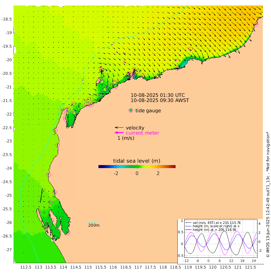 8cm/s 60T +12cm/s rms + 5cm/s -173T. NWSBAR 206m 10cm/s 41T +22cm/s rms + 10cm/s -148T. TAN100 109m 16cm/s 109T +11cm/s rms + 8cm/s -129T. PIL200 208m 26cm/s 126T +13cm/s rms + 7cm/s -137T. PIL100 105m 32cm/s 128T +12cm/s rms + 2cm/s -92T. PIL050 55m 9cm/s 45T +18cm/s rms + 4cm/s -149T. NRSNIN 61m 34cm/s 119T +6cm/s rms + 3cm/s 112T. NW Shelf M6 65m 31cm Withnell Point 18cm Denham 17cm Shark Bay (Inr Bn) 24cm Shark Bay 16cm Useless Loop -6cm Hamelin Pool 45cm Carnarvon 48cm Cape Cuvier 50cm Coral Bay 49cm Norwegian Bay 49cm Badjirrajirra 52cm Tantabiddi 49cm Point Murat 47cm Exmouth 42cm Learmonth 58cm Y Island 54cm North Muiron Island 59cm Roller 60cm Ashburton North 60cm Onslow (Beadon Creek) 62cm Thevenard Island 31cm Large Island 48cm North Sandy Island 63cm Barrow Island (Wapet Landing) 49cm Barrow Island (Tanker Mooring) 87cm Withnell Bay 49cm Trimouille Island 64cm North West Island 43cm Fortescue Road 86cm Steamboat Island 43cm Sholl Island 85cm Fairway Beacon 89cm Mawby Island 87cm Dampier (King Bay) 95cm Cape Legendre 77cm Hauy Island 91cm Port Walcott (Cape Lambert) 93cm Depuch Island 106cm Port Hedland 126cm Bedout Island 217cm Lagrange Bay