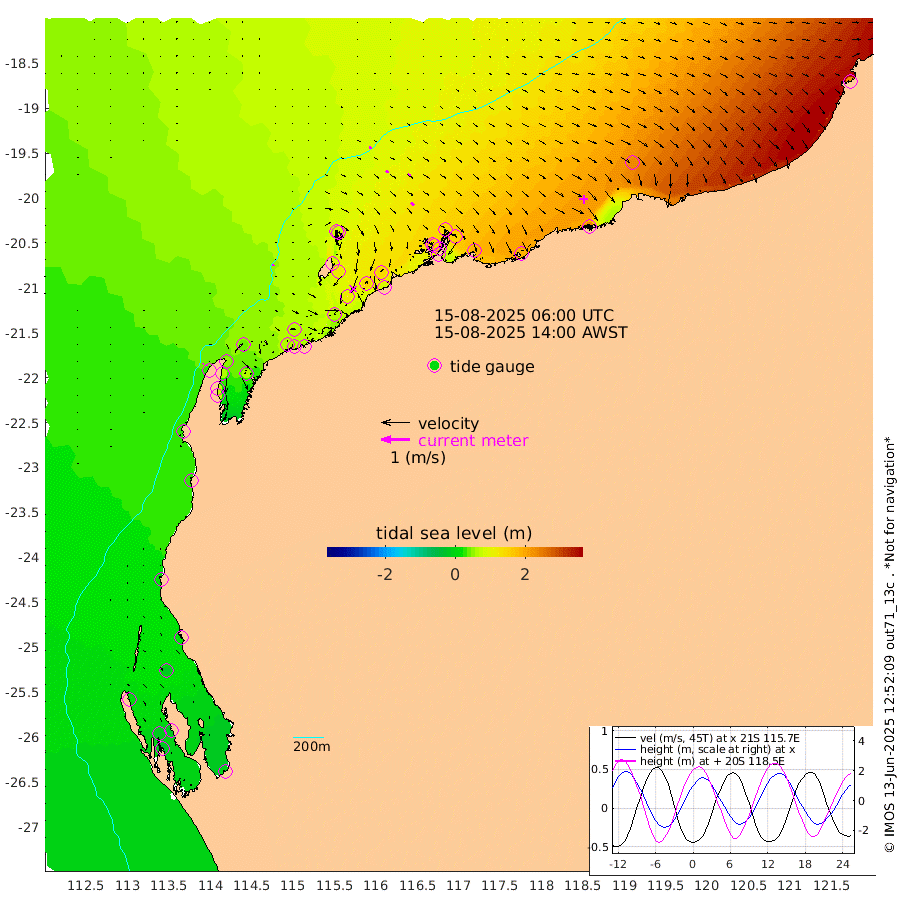 6cm/s 19T +12cm/s rms + 5cm/s -173T. NWSBAR 206m 4cm/s 47T +22cm/s rms + 10cm/s -148T. TAN100 109m 9cm/s 102T +11cm/s rms + 8cm/s -129T. PIL200 208m 12cm/s 120T +13cm/s rms + 7cm/s -137T. PIL100 105m 13cm/s 120T +12cm/s rms + 2cm/s -92T. PIL050 55m 3cm/s 49T +18cm/s rms + 4cm/s -149T. NRSNIN 61m 10cm/s 106T +6cm/s rms + 3cm/s 112T. NW Shelf M6 65m 1cm Withnell Point -16cm Denham -16cm Shark Bay (Inr Bn) -12cm Shark Bay -24cm Useless Loop -10cm Hamelin Pool 21cm Carnarvon 20cm Cape Cuvier 23cm Coral Bay 25cm Norwegian Bay 71cm Badjirrajirra 32cm Tantabiddi 50cm Point Murat 61cm Exmouth 73cm Learmonth 62cm Y Island 44cm North Muiron Island 57cm Roller 62cm Ashburton North 67cm Onslow (Beadon Creek) 65cm Thevenard Island 66cm Large Island 122cm North Sandy Island 94cm Barrow Island (Wapet Landing) 116cm Barrow Island (Tanker Mooring) 144cm Withnell Bay 87cm Trimouille Island 74cm North West Island 85cm Fortescue Road 139cm Steamboat Island 147cm Sholl Island 141cm Fairway Beacon 146cm Mawby Island 145cm Dampier (King Bay) 143cm Cape Legendre 155cm Hauy Island 181cm Port Walcott (Cape Lambert) 188cm Depuch Island 230cm Port Hedland 235cm Bedout Island 229cm Lagrange Bay