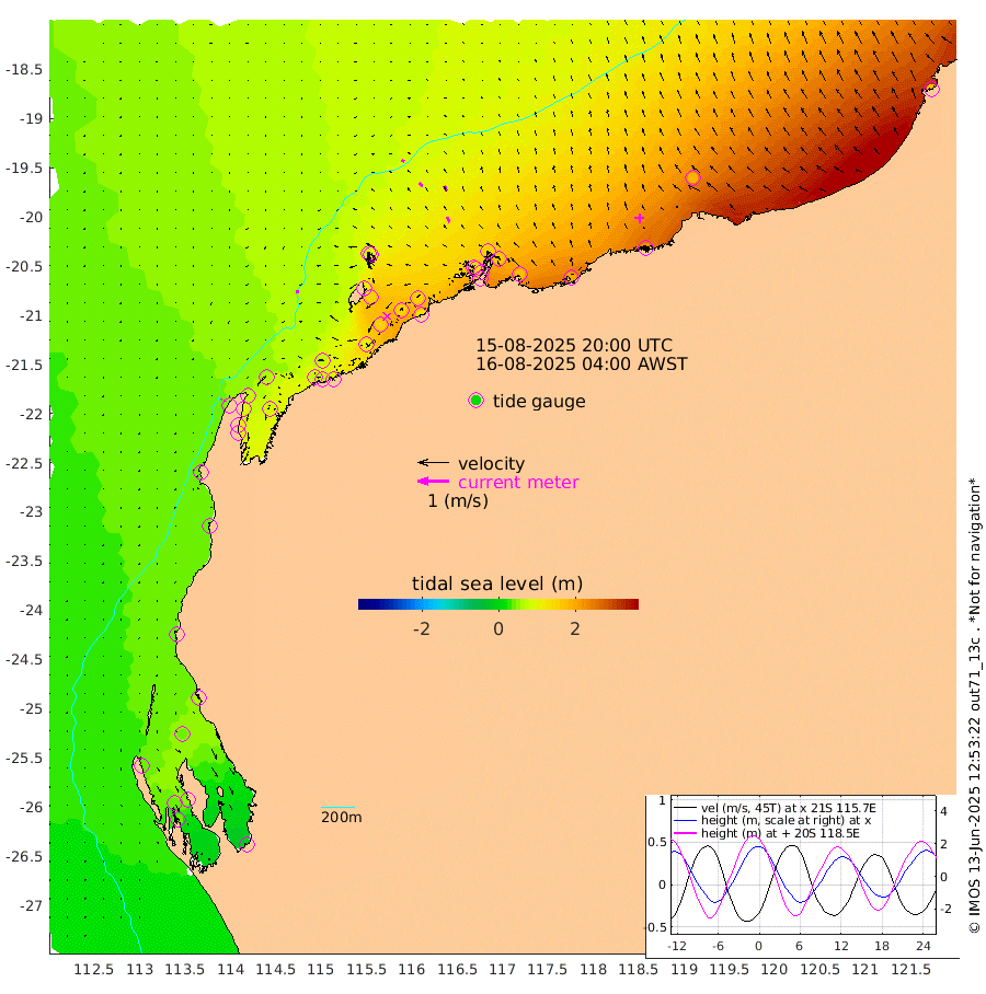 9cm/s -91T +12cm/s rms + 5cm/s -173T. NWSBAR 206m 4cm/s -136T +22cm/s rms + 10cm/s -148T. TAN100 109m 9cm/s -64T +11cm/s rms + 8cm/s -129T. PIL200 208m 15cm/s -36T +13cm/s rms + 7cm/s -137T. PIL100 105m 18cm/s -28T +12cm/s rms + 2cm/s -92T. PIL050 55m 4cm/s -124T +18cm/s rms + 4cm/s -149T. NRSNIN 61m 18cm/s -29T +6cm/s rms + 3cm/s 112T. NW Shelf M6 65m 43cm Withnell Point 46cm Denham 42cm Shark Bay (Inr Bn) 42cm Shark Bay 35cm Useless Loop -12cm Hamelin Pool 58cm Carnarvon 37cm Cape Cuvier 38cm Coral Bay 44cm Norwegian Bay 105cm Badjirrajirra 46cm Tantabiddi 76cm Point Murat 93cm Exmouth 101cm Learmonth 84cm Y Island 62cm North Muiron Island 70cm Roller 75cm Ashburton North 85cm Onslow (Beadon Creek) 78cm Thevenard Island 111cm Large Island 153cm North Sandy Island 112cm Barrow Island (Wapet Landing) 154cm Barrow Island (Tanker Mooring) 143cm Withnell Bay 110cm Trimouille Island 84cm North West Island 124cm Fortescue Road 147cm Steamboat Island 156cm Sholl Island 141cm Fairway Beacon 140cm Mawby Island 143cm Dampier (King Bay) 147cm Cape Legendre 162cm Hauy Island 179cm Port Walcott (Cape Lambert) 195cm Depuch Island 215cm Port Hedland 190cm Bedout Island 175cm Lagrange Bay