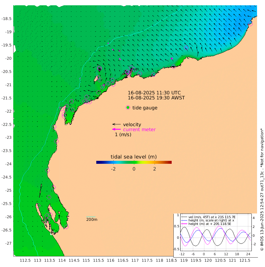 6cm/s -116T +12cm/s rms + 5cm/s -173T. NWSBAR 206m 6cm/s -141T +22cm/s rms + 10cm/s -148T. TAN100 109m 12cm/s -73T +11cm/s rms + 8cm/s -129T. PIL200 208m 19cm/s -57T +13cm/s rms + 7cm/s -137T. PIL100 105m 23cm/s -56T +12cm/s rms + 2cm/s -92T. PIL050 55m 5cm/s -132T +18cm/s rms + 4cm/s -149T. NRSNIN 61m 19cm/s -62T +6cm/s rms + 3cm/s 112T. NW Shelf M6 65m -12cm Withnell Point -13cm Denham -14cm Shark Bay (Inr Bn) -14cm Shark Bay -17cm Useless Loop -6cm Hamelin Pool -22cm Carnarvon -25cm Cape Cuvier -30cm Coral Bay -28cm Norwegian Bay -45cm Badjirrajirra -33cm Tantabiddi -37cm Point Murat -40cm Exmouth -42cm Learmonth -47cm Y Island -40cm North Muiron Island -43cm Roller -49cm Ashburton North -50cm Onslow (Beadon Creek) -50cm Thevenard Island -32cm Large Island -60cm North Sandy Island -60cm Barrow Island (Wapet Landing) -57cm Barrow Island (Tanker Mooring) -91cm Withnell Bay -57cm Trimouille Island -53cm North West Island -41cm Fortescue Road -89cm Steamboat Island -74cm Sholl Island -87cm Fairway Beacon -89cm Mawby Island -90cm Dampier (King Bay) -88cm Cape Legendre -82cm Hauy Island -106cm Port Walcott (Cape Lambert) -108cm Depuch Island -133cm Port Hedland -158cm Bedout Island -137cm Lagrange Bay