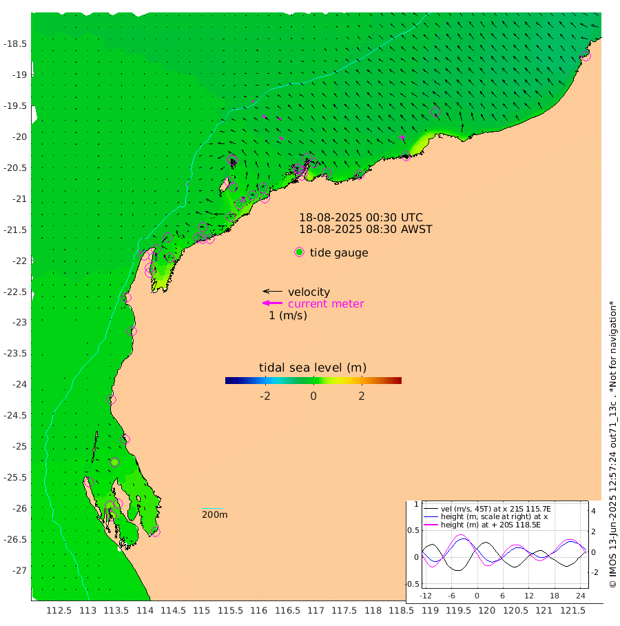 6cm/s -131T +12cm/s rms + 5cm/s -173T. NWSBAR 206m 7cm/s -135T +22cm/s rms + 10cm/s -148T. TAN100 109m 11cm/s -75T +11cm/s rms + 8cm/s -129T. PIL200 208m 18cm/s -52T +13cm/s rms + 7cm/s -137T. PIL100 105m 21cm/s -48T +12cm/s rms + 2cm/s -92T. PIL050 55m 7cm/s -130T +18cm/s rms + 4cm/s -149T. NRSNIN 61m 19cm/s -47T +6cm/s rms + 3cm/s 112T. NW Shelf M6 65m 17cm Withnell Point 41cm Denham 39cm Shark Bay (Inr Bn) 39cm Shark Bay 48cm Useless Loop 13cm Hamelin Pool 3cm Carnarvon -9cm Cape Cuvier -11cm Coral Bay -10cm Norwegian Bay -6cm Badjirrajirra -12cm Tantabiddi -7cm Point Murat -5cm Exmouth -11cm Learmonth -11cm Y Island -11cm North Muiron Island -16cm Roller -16cm Ashburton North -14cm Onslow (Beadon Creek) -16cm Thevenard Island -5cm Large Island -20cm North Sandy Island -18cm Barrow Island (Wapet Landing) -9cm Barrow Island (Tanker Mooring) -36cm Withnell Bay -22cm Trimouille Island -17cm North West Island 0cm Fortescue Road -32cm Steamboat Island -41cm Sholl Island -34cm Fairway Beacon -37cm Mawby Island -36cm Dampier (King Bay) -32cm Cape Legendre -31cm Hauy Island -41cm Port Walcott (Cape Lambert) -35cm Depuch Island -54cm Port Hedland -59cm Bedout Island -46cm Lagrange Bay