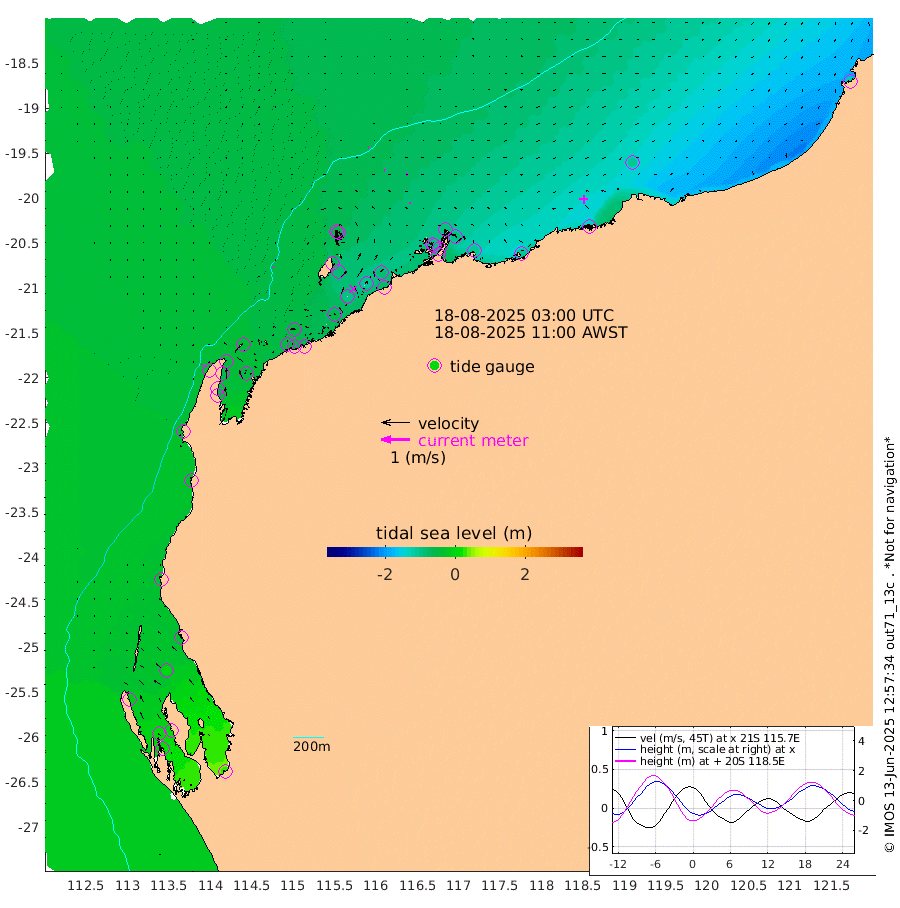 3cm/s 141T +12cm/s rms + 5cm/s -173T. NWSBAR 206m 3cm/s -131T +22cm/s rms + 10cm/s -148T. TAN100 109m 3cm/s -89T +11cm/s rms + 8cm/s -129T. PIL200 208m 5cm/s -84T +13cm/s rms + 7cm/s -137T. PIL100 105m 5cm/s -88T +12cm/s rms + 2cm/s -92T. PIL050 55m 4cm/s -136T +18cm/s rms + 4cm/s -149T. NRSNIN 61m 6cm/s -77T +6cm/s rms + 3cm/s 112T. NW Shelf M6 65m -18cm Withnell Point 4cm Denham 7cm Shark Bay (Inr Bn) 3cm Shark Bay 21cm Useless Loop 25cm Hamelin Pool -39cm Carnarvon -36cm Cape Cuvier -36cm Coral Bay -41cm Norwegian Bay -64cm Badjirrajirra -38cm Tantabiddi -50cm Point Murat -57cm Exmouth -65cm Learmonth -54cm Y Island -44cm North Muiron Island -51cm Roller -54cm Ashburton North -57cm Onslow (Beadon Creek) -55cm Thevenard Island -64cm Large Island -92cm North Sandy Island -72cm Barrow Island (Wapet Landing) -86cm Barrow Island (Tanker Mooring) -92cm Withnell Bay -71cm Trimouille Island -56cm North West Island -68cm Fortescue Road -88cm Steamboat Island -102cm Sholl Island -91cm Fairway Beacon -93cm Mawby Island -93cm Dampier (King Bay) -101cm Cape Legendre -100cm Hauy Island -110cm Port Walcott (Cape Lambert) -104cm Depuch Island -129cm Port Hedland -106cm Bedout Island -122cm Lagrange Bay