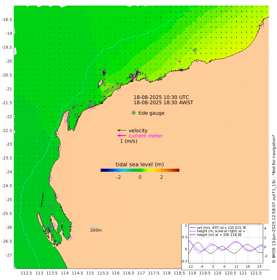 4cm/s -48T +12cm/s rms + 5cm/s -173T. NWSBAR 206m 2cm/s -162T +22cm/s rms + 10cm/s -148T. TAN100 109m 2cm/s -69T +11cm/s rms + 8cm/s -129T. PIL200 208m 4cm/s -48T +13cm/s rms + 7cm/s -137T. PIL100 105m 6cm/s -45T +12cm/s rms + 2cm/s -92T. PIL050 55m 1cm/s -139T +18cm/s rms + 4cm/s -149T. NRSNIN 61m 5cm/s -69T +6cm/s rms + 3cm/s 112T. NW Shelf M6 65m -20cm Withnell Point -33cm Denham -34cm Shark Bay (Inr Bn) -32cm Shark Bay -40cm Useless Loop -11cm Hamelin Pool -12cm Carnarvon -14cm Cape Cuvier -14cm Coral Bay -9cm Norwegian Bay 4cm Badjirrajirra -12cm Tantabiddi -4cm Point Murat 0cm Exmouth 5cm Learmonth -4cm Y Island -10cm North Muiron Island -5cm Roller -4cm Ashburton North -2cm Onslow (Beadon Creek) -4cm Thevenard Island 10cm Large Island 20cm North Sandy Island 7cm Barrow Island (Wapet Landing) 20cm Barrow Island (Tanker Mooring) 14cm Withnell Bay 10cm Trimouille Island -6cm North West Island 25cm Fortescue Road 8cm Steamboat Island 31cm Sholl Island 15cm Fairway Beacon 14cm Mawby Island 15cm Dampier (King Bay) 21cm Cape Legendre 28cm Hauy Island 25cm Port Walcott (Cape Lambert) 19cm Depuch Island 35cm Port Hedland 22cm Bedout Island 57cm Lagrange Bay