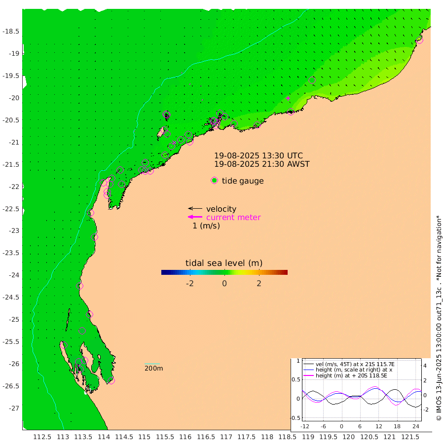 3cm/s -76T +12cm/s rms + 5cm/s -173T. NWSBAR 206m 1cm/s 58T +22cm/s rms + 10cm/s -148T. TAN100 109m 2cm/s -88T +11cm/s rms + 8cm/s -129T. PIL200 208m 3cm/s -59T +13cm/s rms + 7cm/s -137T. PIL100 105m 4cm/s -48T +12cm/s rms + 2cm/s -92T. PIL050 55m 2cm/s 37T +18cm/s rms + 4cm/s -149T. NRSNIN 61m 5cm/s -72T +6cm/s rms + 3cm/s 112T. NW Shelf M6 65m -10cm Withnell Point -24cm Denham -26cm Shark Bay (Inr Bn) -24cm Shark Bay -34cm Useless Loop -15cm Hamelin Pool -4cm Carnarvon -6cm Cape Cuvier -7cm Coral Bay -5cm Norwegian Bay -3cm Badjirrajirra -6cm Tantabiddi -4cm Point Murat -3cm Exmouth 1cm Learmonth -7cm Y Island -7cm North Muiron Island -5cm Roller -3cm Ashburton North -3cm Onslow (Beadon Creek) -3cm Thevenard Island 24cm Large Island 12cm North Sandy Island 2cm Barrow Island (Wapet Landing) 9cm Barrow Island (Tanker Mooring) 7cm Withnell Bay 7cm Trimouille Island -3cm North West Island 32cm Fortescue Road 3cm Steamboat Island 2cm Sholl Island 7cm Fairway Beacon 6cm Mawby Island 7cm Dampier (King Bay) 12cm Cape Legendre 16cm Hauy Island 12cm Port Walcott (Cape Lambert) 24cm Depuch Island 17cm Port Hedland 6cm Bedout Island 71cm Lagrange Bay