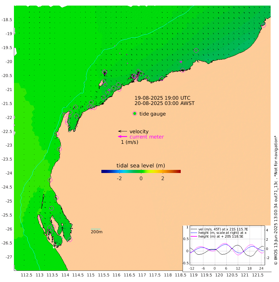 2cm/s 124T +12cm/s rms + 5cm/s -173T. NWSBAR 206m 4cm/s 36T +22cm/s rms + 10cm/s -148T. TAN100 109m 3cm/s 99T +11cm/s rms + 8cm/s -129T. PIL200 208m 6cm/s 126T +13cm/s rms + 7cm/s -137T. PIL100 105m 7cm/s 137T +12cm/s rms + 2cm/s -92T. PIL050 55m 5cm/s 45T +18cm/s rms + 4cm/s -149T. NRSNIN 61m 8cm/s 131T +6cm/s rms + 3cm/s 112T. NW Shelf M6 65m 16cm Withnell Point 11cm Denham 10cm Shark Bay (Inr Bn) 12cm Shark Bay 6cm Useless Loop -8cm Hamelin Pool 22cm Carnarvon 27cm Cape Cuvier 26cm Coral Bay 24cm Norwegian Bay 11cm Badjirrajirra 24cm Tantabiddi 17cm Point Murat 13cm Exmouth 10cm Learmonth 16cm Y Island 21cm North Muiron Island 20cm Roller 17cm Ashburton North 14cm Onslow (Beadon Creek) 17cm Thevenard Island 1cm Large Island 5cm North Sandy Island 9cm Barrow Island (Wapet Landing) -2cm Barrow Island (Tanker Mooring) 1cm Withnell Bay 9cm Trimouille Island 15cm North West Island -18cm Fortescue Road 6cm Steamboat Island 7cm Sholl Island 1cm Fairway Beacon 4cm Mawby Island 2cm Dampier (King Bay) -2cm Cape Legendre -9cm Hauy Island -7cm Port Walcott (Cape Lambert) -14cm Depuch Island -17cm Port Hedland -17cm Bedout Island -68cm Lagrange Bay