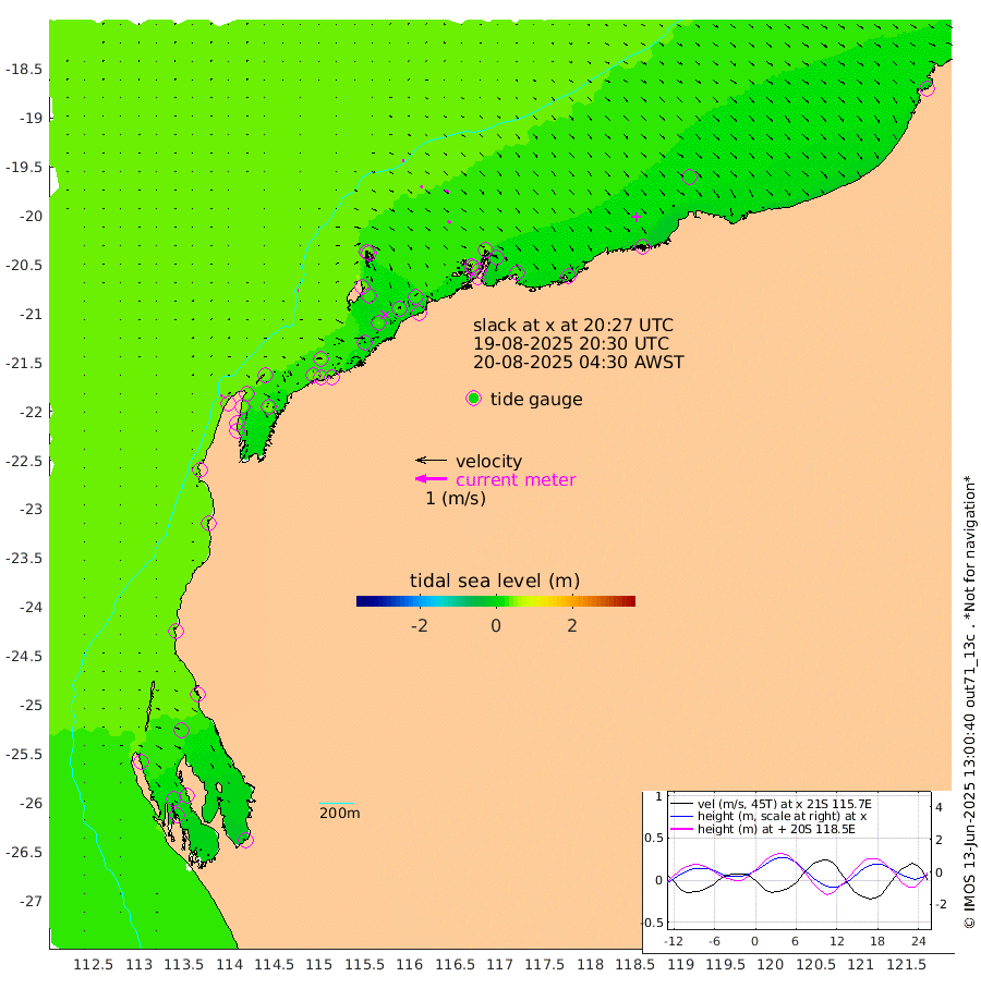 3cm/s 85T +12cm/s rms + 5cm/s -173T. NWSBAR 206m 5cm/s 39T +22cm/s rms + 10cm/s -148T. TAN100 109m 5cm/s 99T +11cm/s rms + 8cm/s -129T. PIL200 208m 9cm/s 120T +13cm/s rms + 7cm/s -137T. PIL100 105m 11cm/s 124T +12cm/s rms + 2cm/s -92T. PIL050 55m 5cm/s 45T +18cm/s rms + 4cm/s -149T. NRSNIN 61m 13cm/s 120T +6cm/s rms + 3cm/s 112T. NW Shelf M6 65m 29cm Withnell Point 23cm Denham 21cm Shark Bay (Inr Bn) 25cm Shark Bay 18cm Useless Loop -9cm Hamelin Pool 38cm Carnarvon 40cm Cape Cuvier 40cm Coral Bay 40cm Norwegian Bay 35cm Badjirrajirra 38cm Tantabiddi 35cm Point Murat 34cm Exmouth 31cm Learmonth 38cm Y Island 38cm North Muiron Island 38cm Roller 37cm Ashburton North 36cm Onslow (Beadon Creek) 38cm Thevenard Island 17cm Large Island 28cm North Sandy Island 34cm Barrow Island (Wapet Landing) 25cm Barrow Island (Tanker Mooring) 32cm Withnell Bay 28cm Trimouille Island 34cm North West Island 7cm Fortescue Road 31cm Steamboat Island 32cm Sholl Island 31cm Fairway Beacon 34cm Mawby Island 33cm Dampier (King Bay) 35cm Cape Legendre 22cm Hauy Island 28cm Port Walcott (Cape Lambert) 11cm Depuch Island 23cm Port Hedland 22cm Bedout Island -1cm Lagrange Bay