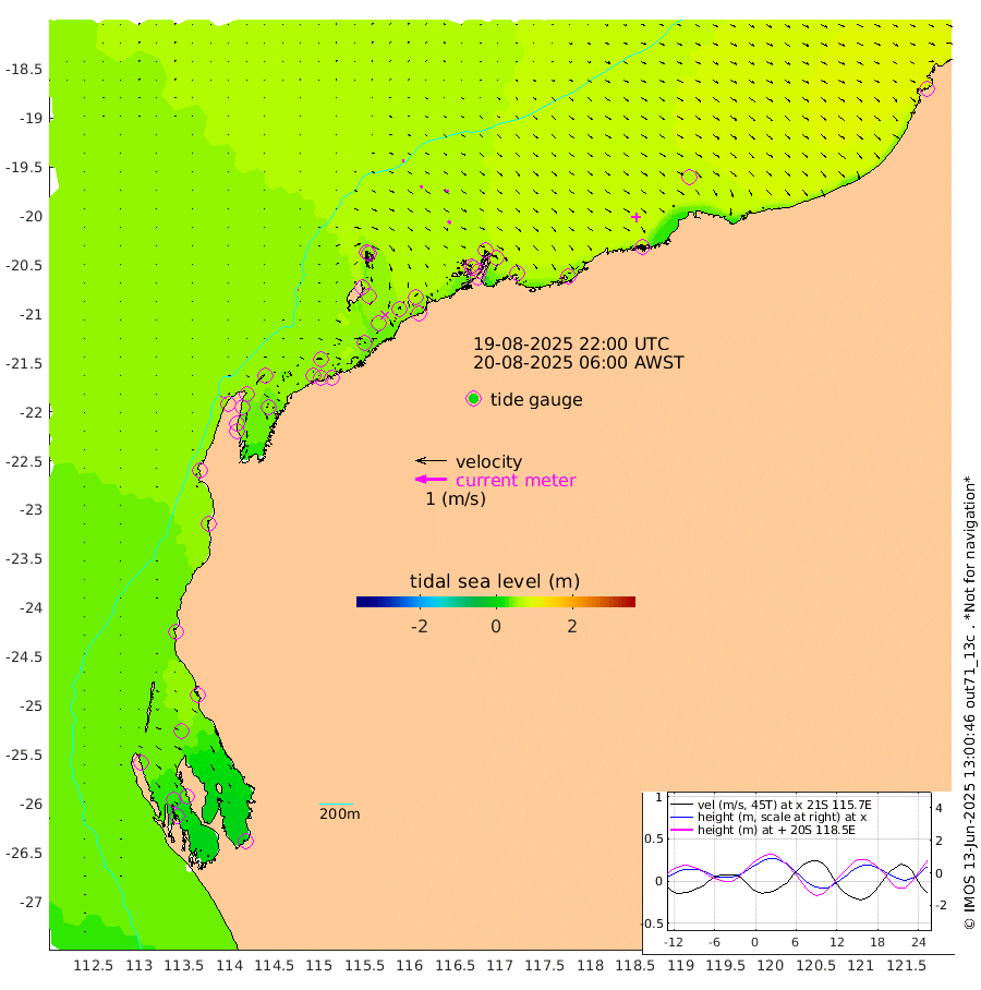 2cm/s 61T +12cm/s rms + 5cm/s -173T. NWSBAR 206m 4cm/s 41T +22cm/s rms + 10cm/s -148T. TAN100 109m 5cm/s 102T +11cm/s rms + 8cm/s -129T. PIL200 208m 8cm/s 113T +13cm/s rms + 7cm/s -137T. PIL100 105m 11cm/s 115T +12cm/s rms + 2cm/s -92T. PIL050 55m 4cm/s 42T +18cm/s rms + 4cm/s -149T. NRSNIN 61m 12cm/s 109T +6cm/s rms + 3cm/s 112T. NW Shelf M6 65m 39cm Withnell Point 35cm Denham 32cm Shark Bay (Inr Bn) 37cm Shark Bay 31cm Useless Loop -8cm Hamelin Pool 50cm Carnarvon 46cm Cape Cuvier 47cm Coral Bay 49cm Norwegian Bay 57cm Badjirrajirra 47cm Tantabiddi 51cm Point Murat 53cm Exmouth 51cm Learmonth 54cm Y Island 49cm North Muiron Island 51cm Roller 53cm Ashburton North 54cm Onslow (Beadon Creek) 55cm Thevenard Island 40cm Large Island 54cm North Sandy Island 58cm Barrow Island (Wapet Landing) 56cm Barrow Island (Tanker Mooring) 63cm Withnell Bay 48cm Trimouille Island 52cm North West Island 43cm Fortescue Road 58cm Steamboat Island 54cm Sholl Island 62cm Fairway Beacon 65cm Mawby Island 64cm Dampier (King Bay) 73cm Cape Legendre 57cm Hauy Island 66cm Port Walcott (Cape Lambert) 49cm Depuch Island 70cm Port Hedland 65cm Bedout Island 85cm Lagrange Bay