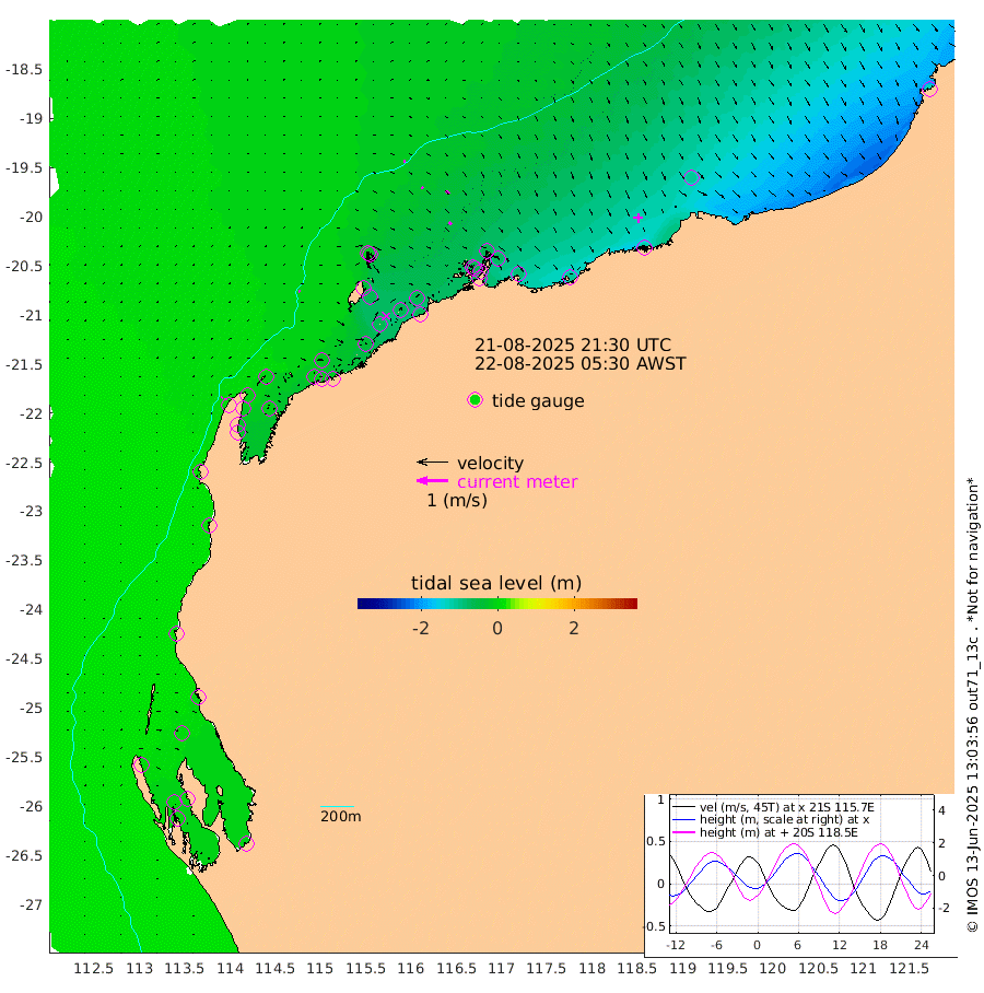 4cm/s 98T +12cm/s rms + 5cm/s -173T. NWSBAR 206m 4cm/s 38T +22cm/s rms + 10cm/s -148T. TAN100 109m 4cm/s 105T +11cm/s rms + 8cm/s -129T. PIL200 208m 8cm/s 135T +13cm/s rms + 7cm/s -137T. PIL100 105m 11cm/s 141T +12cm/s rms + 2cm/s -92T. PIL050 55m 4cm/s 46T +18cm/s rms + 4cm/s -149T. NRSNIN 61m 14cm/s 139T +6cm/s rms + 3cm/s 112T. NW Shelf M6 65m 8cm Withnell Point 7cm Denham 6cm Shark Bay (Inr Bn) 10cm Shark Bay 9cm Useless Loop -1cm Hamelin Pool 8cm Carnarvon 16cm Cape Cuvier 15cm Coral Bay 13cm Norwegian Bay -24cm Badjirrajirra 8cm Tantabiddi -8cm Point Murat -18cm Exmouth -31cm Learmonth -11cm Y Island 0cm North Muiron Island -6cm Roller -10cm Ashburton North -16cm Onslow (Beadon Creek) -11cm Thevenard Island -45cm Large Island -60cm North Sandy Island -35cm Barrow Island (Wapet Landing) -61cm Barrow Island (Tanker Mooring) -62cm Withnell Bay -37cm Trimouille Island -22cm North West Island -60cm Fortescue Road -61cm Steamboat Island -61cm Sholl Island -61cm Fairway Beacon -60cm Mawby Island -61cm Dampier (King Bay) -61cm Cape Legendre -79cm Hauy Island -88cm Port Walcott (Cape Lambert) -112cm Depuch Island -118cm Port Hedland -106cm Bedout Island -124cm Lagrange Bay