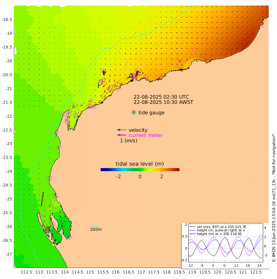 2cm/s -27T +12cm/s rms + 5cm/s -173T. NWSBAR 206m 1cm/s 32T +22cm/s rms + 10cm/s -148T. TAN100 109m 2cm/s 100T +11cm/s rms + 8cm/s -129T. PIL200 208m 4cm/s 81T +13cm/s rms + 7cm/s -137T. PIL100 105m 6cm/s 81T +12cm/s rms + 2cm/s -92T. PIL050 55m 1cm/s 26T +18cm/s rms + 4cm/s -149T. NRSNIN 61m 6cm/s 17T +6cm/s rms + 3cm/s 112T. NW Shelf M6 65m 41cm Withnell Point 40cm Denham 39cm Shark Bay (Inr Bn) 42cm Shark Bay 35cm Useless Loop -5cm Hamelin Pool 51cm Carnarvon 38cm Cape Cuvier 40cm Coral Bay 40cm Norwegian Bay 85cm Badjirrajirra 47cm Tantabiddi 66cm Point Murat 76cm Exmouth 86cm Learmonth 72cm Y Island 57cm North Muiron Island 65cm Roller 72cm Ashburton North 78cm Onslow (Beadon Creek) 75cm Thevenard Island 97cm Large Island 121cm North Sandy Island 100cm Barrow Island (Wapet Landing) 124cm Barrow Island (Tanker Mooring) 135cm Withnell Bay 90cm Trimouille Island 85cm North West Island 113cm Fortescue Road 126cm Steamboat Island 112cm Sholl Island 133cm Fairway Beacon 136cm Mawby Island 136cm Dampier (King Bay) 141cm Cape Legendre 143cm Hauy Island 165cm Port Walcott (Cape Lambert) 177cm Depuch Island 200cm Port Hedland 194cm Bedout Island 245cm Lagrange Bay
