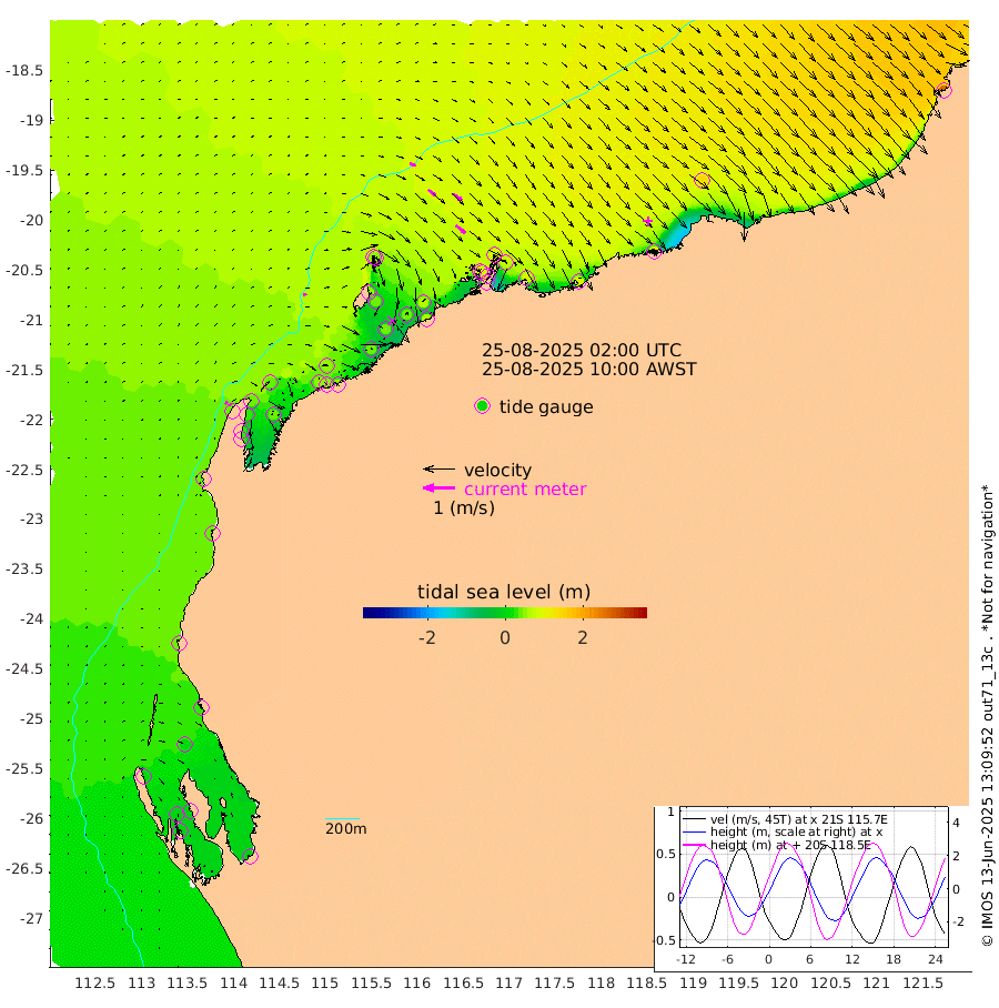 11cm/s 61T +12cm/s rms + 5cm/s -173T. NWSBAR 206m 11cm/s 42T +22cm/s rms + 10cm/s -148T. TAN100 109m 19cm/s 109T +11cm/s rms + 8cm/s -129T. PIL200 208m 32cm/s 127T +13cm/s rms + 7cm/s -137T. PIL100 105m 39cm/s 130T +12cm/s rms + 2cm/s -92T. PIL050 55m 11cm/s 46T +18cm/s rms + 4cm/s -149T. NRSNIN 61m 35cm/s 125T +6cm/s rms + 3cm/s 112T. NW Shelf M6 65m 11cm Withnell Point -4cm Denham -4cm Shark Bay (Inr Bn) 3cm Shark Bay -4cm Useless Loop -4cm Hamelin Pool 26cm Carnarvon 35cm Cape Cuvier 39cm Coral Bay 37cm Norwegian Bay 32cm Badjirrajirra 41cm Tantabiddi 34cm Point Murat 31cm Exmouth 29cm Learmonth 44cm Y Island 43cm North Muiron Island 47cm Roller 51cm Ashburton North 47cm Onslow (Beadon Creek) 52cm Thevenard Island 45cm Large Island 39cm North Sandy Island 52cm Barrow Island (Wapet Landing) 34cm Barrow Island (Tanker Mooring) 82cm Withnell Bay 43cm Trimouille Island 52cm North West Island 62cm Fortescue Road 67cm Steamboat Island 40cm Sholl Island 77cm Fairway Beacon 81cm Mawby Island 82cm Dampier (King Bay) 82cm Cape Legendre 68cm Hauy Island 87cm Port Walcott (Cape Lambert) 88cm Depuch Island 107cm Port Hedland 139cm Bedout Island 262cm Lagrange Bay