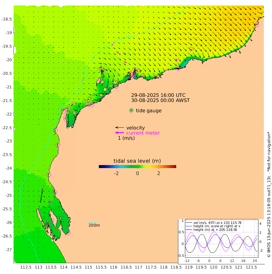 6cm/s 63T +12cm/s rms + 5cm/s -173T. NWSBAR 206m 10cm/s 39T +22cm/s rms + 10cm/s -148T. TAN100 109m 16cm/s 109T +11cm/s rms + 8cm/s -129T. PIL200 208m 27cm/s 125T +13cm/s rms + 7cm/s -137T. PIL100 105m 32cm/s 126T +12cm/s rms + 2cm/s -92T. PIL050 55m 11cm/s 46T +18cm/s rms + 4cm/s -149T. NRSNIN 61m 31cm/s 124T +6cm/s rms + 3cm/s 112T. NW Shelf M6 65m 18cm Withnell Point 0cm Denham 3cm Shark Bay (Inr Bn) 2cm Shark Bay -6cm Useless Loop -10cm Hamelin Pool 33cm Carnarvon 40cm Cape Cuvier 43cm Coral Bay 41cm Norwegian Bay 39cm Badjirrajirra 45cm Tantabiddi 40cm Point Murat 39cm Exmouth 42cm Learmonth 49cm Y Island 48cm North Muiron Island 54cm Roller 54cm Ashburton North 52cm Onslow (Beadon Creek) 55cm Thevenard Island 45cm Large Island 58cm North Sandy Island 58cm Barrow Island (Wapet Landing) 46cm Barrow Island (Tanker Mooring) 88cm Withnell Bay 61cm Trimouille Island 56cm North West Island 44cm Fortescue Road 81cm Steamboat Island 55cm Sholl Island 84cm Fairway Beacon 88cm Mawby Island 87cm Dampier (King Bay) 88cm Cape Legendre 76cm Hauy Island 95cm Port Walcott (Cape Lambert) 110cm Depuch Island 116cm Port Hedland 130cm Bedout Island 194cm Lagrange Bay