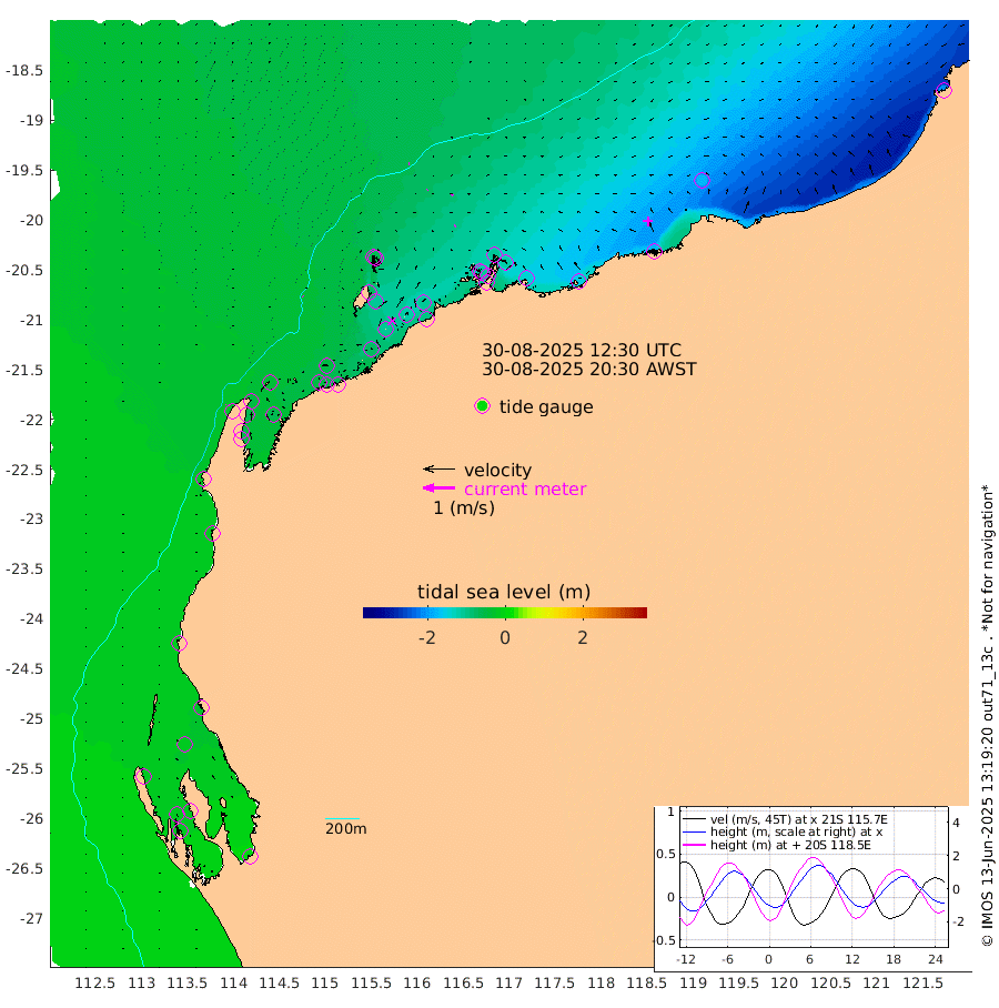 2cm/s 129T +12cm/s rms + 5cm/s -173T. NWSBAR 206m 1cm/s 63T +22cm/s rms + 10cm/s -148T. TAN100 109m 1cm/s -89T +11cm/s rms + 8cm/s -129T. PIL200 208m 2cm/s -153T +13cm/s rms + 7cm/s -137T. PIL100 105m 4cm/s -131T +12cm/s rms + 2cm/s -92T. PIL050 55m 1cm/s 58T +18cm/s rms + 4cm/s -149T. NRSNIN 61m 7cm/s -140T +6cm/s rms + 3cm/s 112T. NW Shelf M6 65m -15cm Withnell Point -18cm Denham -18cm Shark Bay (Inr Bn) -18cm Shark Bay -18cm Useless Loop -2cm Hamelin Pool -24cm Carnarvon -16cm Cape Cuvier -19cm Coral Bay -21cm Norwegian Bay -66cm Badjirrajirra -26cm Tantabiddi -45cm Point Murat -57cm Exmouth -64cm Learmonth -58cm Y Island -39cm North Muiron Island -49cm Roller -51cm Ashburton North -57cm Onslow (Beadon Creek) -53cm Thevenard Island -74cm Large Island -107cm North Sandy Island -78cm Barrow Island (Wapet Landing) -104cm Barrow Island (Tanker Mooring) -111cm Withnell Bay -67cm Trimouille Island -60cm North West Island -95cm Fortescue Road -107cm Steamboat Island -115cm Sholl Island -109cm Fairway Beacon -113cm Mawby Island -111cm Dampier (King Bay) -105cm Cape Legendre -121cm Hauy Island -142cm Port Walcott (Cape Lambert) -155cm Depuch Island -178cm Port Hedland -178cm Bedout Island -210cm Lagrange Bay