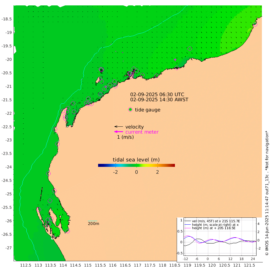 2cm/s 26T +12cm/s rms + 5cm/s -173T. NWSBAR 206m 1cm/s -140T +22cm/s rms + 10cm/s -148T. TAN100 109m 4cm/s 97T +11cm/s rms + 8cm/s -129T. PIL200 208m 4cm/s 136T +13cm/s rms + 7cm/s -137T. PIL100 105m 3cm/s 153T +12cm/s rms + 2cm/s -92T. PIL050 55m 2cm/s -153T +18cm/s rms + 4cm/s -149T. NRSNIN 61m 5cm/s 129T +6cm/s rms + 3cm/s 112T. NW Shelf M6 65m -27cm Withnell Point -28cm Denham -25cm Shark Bay (Inr Bn) -29cm Shark Bay -23cm Useless Loop 9cm Hamelin Pool -28cm Carnarvon -22cm Cape Cuvier -22cm Coral Bay -21cm Norwegian Bay -15cm Badjirrajirra -19cm Tantabiddi -18cm Point Murat -17cm Exmouth -13cm Learmonth -14cm Y Island -17cm North Muiron Island -13cm Roller -16cm Ashburton North -15cm Onslow (Beadon Creek) -16cm Thevenard Island -49cm Large Island -9cm North Sandy Island -12cm Barrow Island (Wapet Landing) -11cm Barrow Island (Tanker Mooring) -2cm Withnell Bay -12cm Trimouille Island -14cm North West Island -48cm Fortescue Road 0cm Steamboat Island 12cm Sholl Island -2cm Fairway Beacon 1cm Mawby Island -3cm Dampier (King Bay) -6cm Cape Legendre -1cm Hauy Island 3cm Port Walcott (Cape Lambert) 1cm Depuch Island 13cm Port Hedland 21cm Bedout Island -45cm Lagrange Bay
