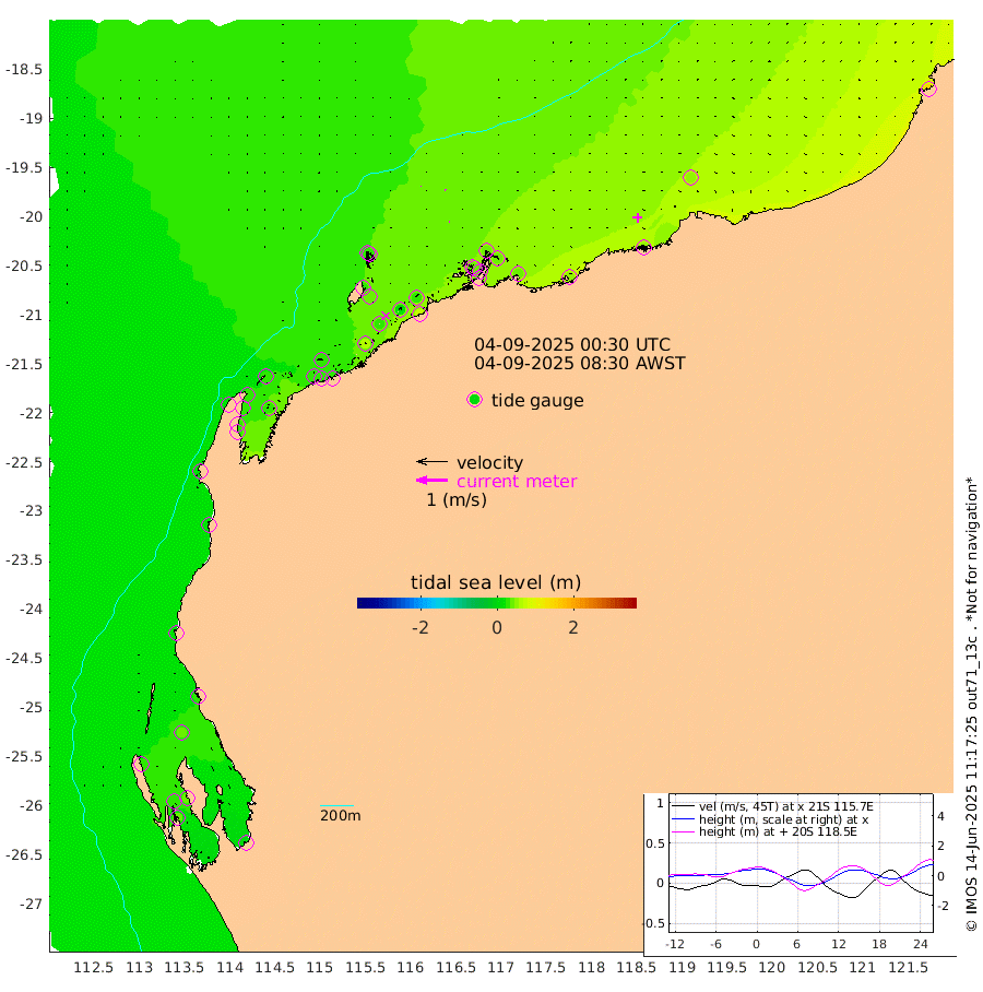 0cm/s 46T +12cm/s rms + 5cm/s -173T. NWSBAR 206m 1cm/s -134T +22cm/s rms + 10cm/s -148T. TAN100 109m 0cm/s -141T +11cm/s rms + 8cm/s -129T. PIL200 208m 1cm/s 37T +13cm/s rms + 7cm/s -137T. PIL100 105m 3cm/s 76T +12cm/s rms + 2cm/s -92T. PIL050 55m 0cm/s -36T +18cm/s rms + 4cm/s -149T. NRSNIN 61m 3cm/s -8T +6cm/s rms + 3cm/s 112T. NW Shelf M6 65m 26cm Withnell Point 35cm Denham 34cm Shark Bay (Inr Bn) 37cm Shark Bay 37cm Useless Loop 2cm Hamelin Pool 26cm Carnarvon 17cm Cape Cuvier 19cm Coral Bay 20cm Norwegian Bay 29cm Badjirrajirra 20cm Tantabiddi 25cm Point Murat 28cm Exmouth 26cm Learmonth 29cm Y Island 24cm North Muiron Island 25cm Roller 26cm Ashburton North 27cm Onslow (Beadon Creek) 28cm Thevenard Island 59cm Large Island 33cm North Sandy Island 32cm Barrow Island (Wapet Landing) 37cm Barrow Island (Tanker Mooring) 38cm Withnell Bay 27cm Trimouille Island 27cm North West Island 72cm Fortescue Road 28cm Steamboat Island 18cm Sholl Island 36cm Fairway Beacon 34cm Mawby Island 38cm Dampier (King Bay) 39cm Cape Legendre 38cm Hauy Island 43cm Port Walcott (Cape Lambert) 50cm Depuch Island 48cm Port Hedland 51cm Bedout Island 154cm Lagrange Bay