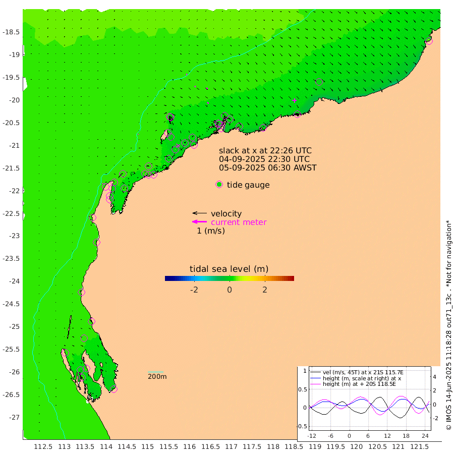 3cm/s 68T +12cm/s rms + 5cm/s -173T. NWSBAR 206m 3cm/s 41T +22cm/s rms + 10cm/s -148T. TAN100 109m 6cm/s 106T +11cm/s rms + 8cm/s -129T. PIL200 208m 9cm/s 125T +13cm/s rms + 7cm/s -137T. PIL100 105m 12cm/s 126T +12cm/s rms + 2cm/s -92T. PIL050 55m 3cm/s 41T +18cm/s rms + 4cm/s -149T. NRSNIN 61m 13cm/s 115T +6cm/s rms + 3cm/s 112T. NW Shelf M6 65m 25cm Withnell Point 24cm Denham 22cm Shark Bay (Inr Bn) 27cm Shark Bay 24cm Useless Loop -3cm Hamelin Pool 30cm Carnarvon 30cm Cape Cuvier 30cm Coral Bay 31cm Norwegian Bay 21cm Badjirrajirra 28cm Tantabiddi 24cm Point Murat 22cm Exmouth 12cm Learmonth 28cm Y Island 28cm North Muiron Island 27cm Roller 25cm Ashburton North 24cm Onslow (Beadon Creek) 26cm Thevenard Island 5cm Large Island 3cm North Sandy Island 18cm Barrow Island (Wapet Landing) 7cm Barrow Island (Tanker Mooring) 15cm Withnell Bay 10cm Trimouille Island 21cm North West Island 5cm Fortescue Road 18cm Steamboat Island 0cm Sholl Island 14cm Fairway Beacon 16cm Mawby Island 15cm Dampier (King Bay) 22cm Cape Legendre 8cm Hauy Island 6cm Port Walcott (Cape Lambert) -3cm Depuch Island -2cm Port Hedland 4cm Bedout Island 43cm Lagrange Bay