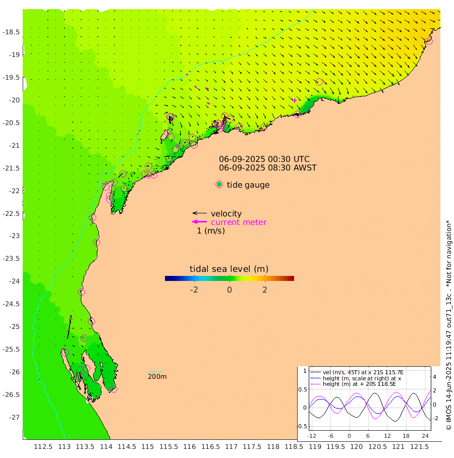 5cm/s 55T +12cm/s rms + 5cm/s -173T. NWSBAR 206m 6cm/s 42T +22cm/s rms + 10cm/s -148T. TAN100 109m 10cm/s 107T +11cm/s rms + 8cm/s -129T. PIL200 208m 16cm/s 123T +13cm/s rms + 7cm/s -137T. PIL100 105m 20cm/s 125T +12cm/s rms + 2cm/s -92T. PIL050 55m 6cm/s 43T +18cm/s rms + 4cm/s -149T. NRSNIN 61m 18cm/s 111T +6cm/s rms + 3cm/s 112T. NW Shelf M6 65m 29cm Withnell Point 23cm Denham 22cm Shark Bay (Inr Bn) 27cm Shark Bay 22cm Useless Loop -5cm Hamelin Pool 39cm Carnarvon 37cm Cape Cuvier 39cm Coral Bay 40cm Norwegian Bay 45cm Badjirrajirra 41cm Tantabiddi 41cm Point Murat 43cm Exmouth 39cm Learmonth 50cm Y Island 45cm North Muiron Island 48cm Roller 49cm Ashburton North 50cm Onslow (Beadon Creek) 51cm Thevenard Island 45cm Large Island 47cm North Sandy Island 55cm Barrow Island (Wapet Landing) 49cm Barrow Island (Tanker Mooring) 74cm Withnell Bay 42cm Trimouille Island 53cm North West Island 59cm Fortescue Road 70cm Steamboat Island 40cm Sholl Island 71cm Fairway Beacon 74cm Mawby Island 73cm Dampier (King Bay) 80cm Cape Legendre 70cm Hauy Island 79cm Port Walcott (Cape Lambert) 86cm Depuch Island 92cm Port Hedland 101cm Bedout Island 199cm Lagrange Bay