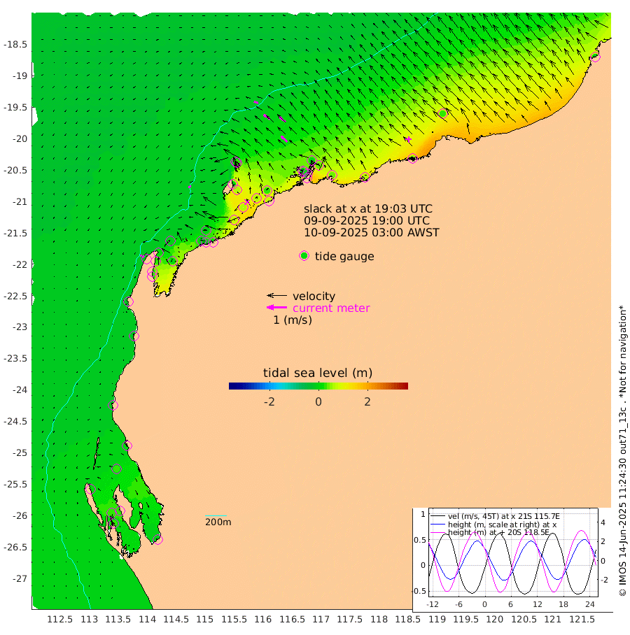 14cm/s -113T +12cm/s rms + 5cm/s -173T. NWSBAR 206m 11cm/s -137T +22cm/s rms + 10cm/s -148T. TAN100 109m 23cm/s -73T +11cm/s rms + 8cm/s -129T. PIL200 208m 37cm/s -52T +13cm/s rms + 7cm/s -137T. PIL100 105m 43cm/s -48T +12cm/s rms + 2cm/s -92T. PIL050 55m 11cm/s -129T +18cm/s rms + 4cm/s -149T. NRSNIN 61m 41cm/s -50T +6cm/s rms + 3cm/s 112T. NW Shelf M6 65m 9cm Withnell Point 28cm Denham 25cm Shark Bay (Inr Bn) 24cm Shark Bay 24cm Useless Loop -1cm Hamelin Pool 5cm Carnarvon -16cm Cape Cuvier -17cm Coral Bay -14cm Norwegian Bay 30cm Badjirrajirra -14cm Tantabiddi 11cm Point Murat 24cm Exmouth 29cm Learmonth 10cm Y Island -4cm North Muiron Island -2cm Roller -1cm Ashburton North 6cm Onslow (Beadon Creek) -1cm Thevenard Island 70cm Large Island 67cm North Sandy Island 21cm Barrow Island (Wapet Landing) 67cm Barrow Island (Tanker Mooring) 17cm Withnell Bay 25cm Trimouille Island 3cm North West Island 75cm Fortescue Road 24cm Steamboat Island 57cm Sholl Island 20cm Fairway Beacon 14cm Mawby Island 18cm Dampier (King Bay) 9cm Cape Legendre 43cm Hauy Island 40cm Port Walcott (Cape Lambert) 56cm Depuch Island 49cm Port Hedland 23cm Bedout Island -4cm Lagrange Bay