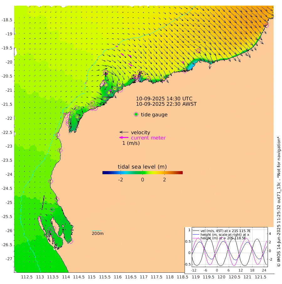 10cm/s 58T +12cm/s rms + 5cm/s -173T. NWSBAR 206m 13cm/s 41T +22cm/s rms + 10cm/s -148T. TAN100 109m 22cm/s 109T +11cm/s rms + 8cm/s -129T. PIL200 208m 38cm/s 125T +13cm/s rms + 7cm/s -137T. PIL100 105m 45cm/s 127T +12cm/s rms + 2cm/s -92T. PIL050 55m 13cm/s 47T +18cm/s rms + 4cm/s -149T. NRSNIN 61m 44cm/s 123T +6cm/s rms + 3cm/s 112T. NW Shelf M6 65m 16cm Withnell Point -6cm Denham -3cm Shark Bay (Inr Bn) -4cm Shark Bay -10cm Useless Loop -8cm Hamelin Pool 34cm Carnarvon 45cm Cape Cuvier 49cm Coral Bay 49cm Norwegian Bay 45cm Badjirrajirra 52cm Tantabiddi 45cm Point Murat 44cm Exmouth 47cm Learmonth 56cm Y Island 55cm North Muiron Island 60cm Roller 64cm Ashburton North 63cm Onslow (Beadon Creek) 66cm Thevenard Island 35cm Large Island 56cm North Sandy Island 70cm Barrow Island (Wapet Landing) 49cm Barrow Island (Tanker Mooring) 110cm Withnell Bay 70cm Trimouille Island 68cm North West Island 44cm Fortescue Road 100cm Steamboat Island 61cm Sholl Island 104cm Fairway Beacon 109cm Mawby Island 109cm Dampier (King Bay) 118cm Cape Legendre 94cm Hauy Island 118cm Port Walcott (Cape Lambert) 125cm Depuch Island 147cm Port Hedland 168cm Bedout Island 239cm Lagrange Bay