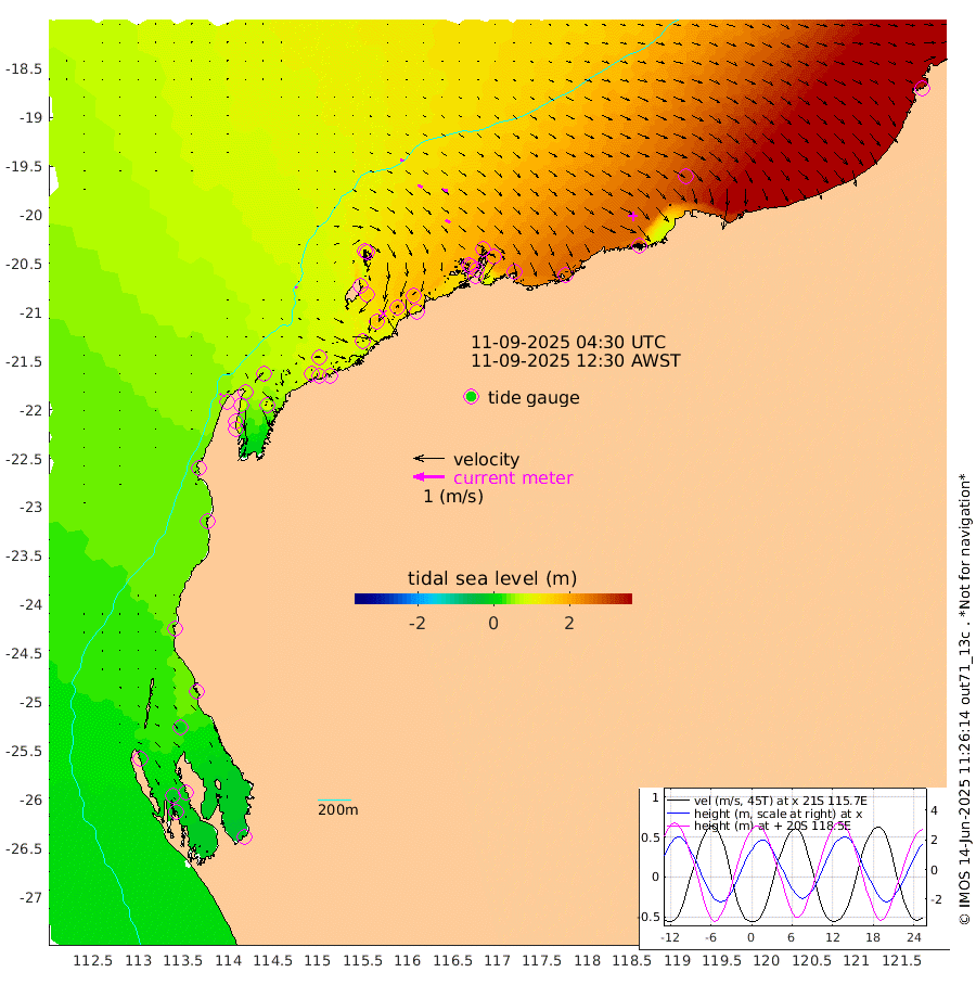 6cm/s 8T +12cm/s rms + 5cm/s -173T. NWSBAR 206m 6cm/s 44T +22cm/s rms + 10cm/s -148T. TAN100 109m 11cm/s 102T +11cm/s rms + 8cm/s -129T. PIL200 208m 15cm/s 117T +13cm/s rms + 7cm/s -137T. PIL100 105m 18cm/s 118T +12cm/s rms + 2cm/s -92T. PIL050 55m 5cm/s 45T +18cm/s rms + 4cm/s -149T. NRSNIN 61m 16cm/s 107T +6cm/s rms + 3cm/s 112T. NW Shelf M6 65m 12cm Withnell Point -10cm Denham -11cm Shark Bay (Inr Bn) -7cm Shark Bay -22cm Useless Loop -16cm Hamelin Pool 38cm Carnarvon 35cm Cape Cuvier 38cm Coral Bay 41cm Norwegian Bay 98cm Badjirrajirra 50cm Tantabiddi 72cm Point Murat 85cm Exmouth 101cm Learmonth 86cm Y Island 65cm North Muiron Island 81cm Roller 87cm Ashburton North 94cm Onslow (Beadon Creek) 91cm Thevenard Island 95cm Large Island 164cm North Sandy Island 128cm Barrow Island (Wapet Landing) 156cm Barrow Island (Tanker Mooring) 192cm Withnell Bay 119cm Trimouille Island 104cm North West Island 120cm Fortescue Road 185cm Steamboat Island 181cm Sholl Island 187cm Fairway Beacon 193cm Mawby Island 192cm Dampier (King Bay) 192cm Cape Legendre 205cm Hauy Island 238cm Port Walcott (Cape Lambert) 258cm Depuch Island 299cm Port Hedland 299cm Bedout Island 336cm Lagrange Bay