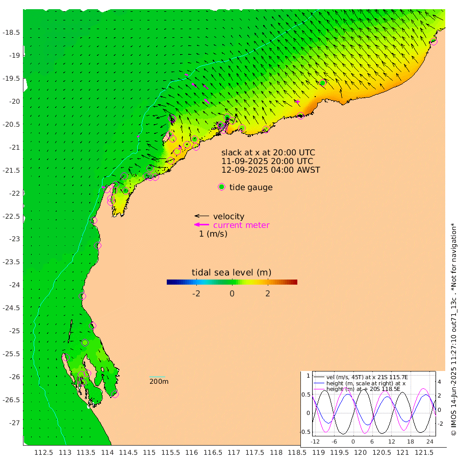 14cm/s -110T +12cm/s rms + 5cm/s -173T. NWSBAR 206m 13cm/s -137T +22cm/s rms + 10cm/s -148T. TAN100 109m 23cm/s -72T +11cm/s rms + 8cm/s -129T. PIL200 208m 40cm/s -51T +13cm/s rms + 7cm/s -137T. PIL100 105m 46cm/s -47T +12cm/s rms + 2cm/s -92T. PIL050 55m 13cm/s -130T +18cm/s rms + 4cm/s -149T. NRSNIN 61m 43cm/s -48T +6cm/s rms + 3cm/s 112T. NW Shelf M6 65m 20cm Withnell Point 44cm Denham 40cm Shark Bay (Inr Bn) 39cm Shark Bay 42cm Useless Loop 3cm Hamelin Pool 14cm Carnarvon -10cm Cape Cuvier -12cm Coral Bay -7cm Norwegian Bay 40cm Badjirrajirra -8cm Tantabiddi 19cm Point Murat 33cm Exmouth 35cm Learmonth 18cm Y Island 2cm North Muiron Island 4cm Roller 4cm Ashburton North 13cm Onslow (Beadon Creek) 5cm Thevenard Island 72cm Large Island 69cm North Sandy Island 28cm Barrow Island (Wapet Landing) 75cm Barrow Island (Tanker Mooring) 22cm Withnell Bay 30cm Trimouille Island 9cm North West Island 79cm Fortescue Road 31cm Steamboat Island 59cm Sholl Island 24cm Fairway Beacon 19cm Mawby Island 22cm Dampier (King Bay) 19cm Cape Legendre 49cm Hauy Island 43cm Port Walcott (Cape Lambert) 57cm Depuch Island 50cm Port Hedland 22cm Bedout Island 2cm Lagrange Bay
