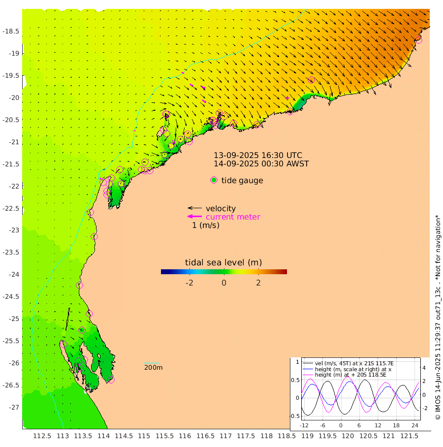 7cm/s 61T +12cm/s rms + 5cm/s -173T. NWSBAR 206m 11cm/s 40T +22cm/s rms + 10cm/s -148T. TAN100 109m 16cm/s 108T +11cm/s rms + 8cm/s -129T. PIL200 208m 28cm/s 122T +13cm/s rms + 7cm/s -137T. PIL100 105m 33cm/s 125T +12cm/s rms + 2cm/s -92T. PIL050 55m 11cm/s 46T +18cm/s rms + 4cm/s -149T. NRSNIN 61m 35cm/s 119T +6cm/s rms + 3cm/s 112T. NW Shelf M6 65m 35cm Withnell Point 17cm Denham 17cm Shark Bay (Inr Bn) 19cm Shark Bay 8cm Useless Loop -13cm Hamelin Pool 55cm Carnarvon 59cm Cape Cuvier 63cm Coral Bay 61cm Norwegian Bay 77cm Badjirrajirra 67cm Tantabiddi 69cm Point Murat 72cm Exmouth 79cm Learmonth 80cm Y Island 73cm North Muiron Island 81cm Roller 85cm Ashburton North 86cm Onslow (Beadon Creek) 87cm Thevenard Island 71cm Large Island 103cm North Sandy Island 99cm Barrow Island (Wapet Landing) 94cm Barrow Island (Tanker Mooring) 139cm Withnell Bay 94cm Trimouille Island 95cm North West Island 72cm Fortescue Road 136cm Steamboat Island 108cm Sholl Island 134cm Fairway Beacon 140cm Mawby Island 139cm Dampier (King Bay) 141cm Cape Legendre 129cm Hauy Island 156cm Port Walcott (Cape Lambert) 164cm Depuch Island 189cm Port Hedland 196cm Bedout Island 227cm Lagrange Bay