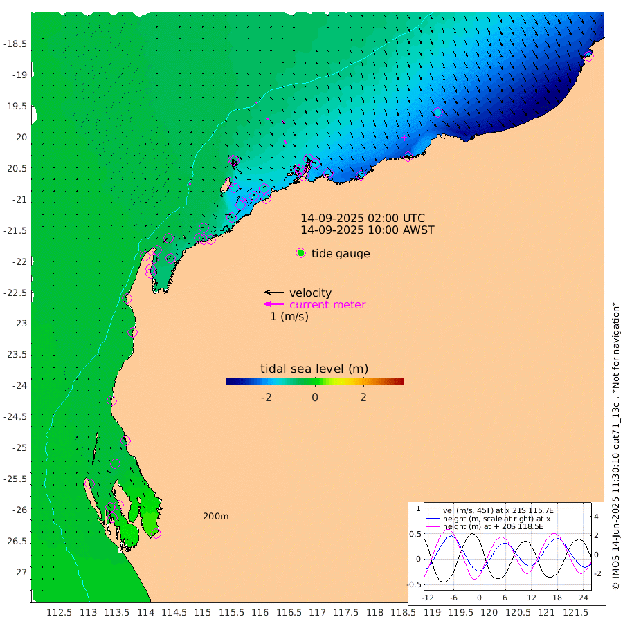 8cm/s 91T +12cm/s rms + 5cm/s -173T. NWSBAR 206m 2cm/s 36T +22cm/s rms + 10cm/s -148T. TAN100 109m 7cm/s 115T +11cm/s rms + 8cm/s -129T. PIL200 208m 14cm/s 141T +13cm/s rms + 7cm/s -137T. PIL100 105m 18cm/s 146T +12cm/s rms + 2cm/s -92T. PIL050 55m 1cm/s 76T +18cm/s rms + 4cm/s -149T. NRSNIN 61m 14cm/s 151T +6cm/s rms + 3cm/s 112T. NW Shelf M6 65m -40cm Withnell Point -26cm Denham -21cm Shark Bay (Inr Bn) -25cm Shark Bay -5cm Useless Loop 26cm Hamelin Pool -58cm Carnarvon -41cm Cape Cuvier -41cm Coral Bay -47cm Norwegian Bay -99cm Badjirrajirra -46cm Tantabiddi -73cm Point Murat -88cm Exmouth -99cm Learmonth -77cm Y Island -58cm North Muiron Island -69cm Roller -71cm Ashburton North -80cm Onslow (Beadon Creek) -74cm Thevenard Island -120cm Large Island -147cm North Sandy Island -104cm Barrow Island (Wapet Landing) -145cm Barrow Island (Tanker Mooring) -128cm Withnell Bay -102cm Trimouille Island -80cm North West Island -126cm Fortescue Road -130cm Steamboat Island -147cm Sholl Island -129cm Fairway Beacon -130cm Mawby Island -129cm Dampier (King Bay) -135cm Cape Legendre -149cm Hauy Island -161cm Port Walcott (Cape Lambert) -168cm Depuch Island -189cm Port Hedland -149cm Bedout Island -178cm Lagrange Bay