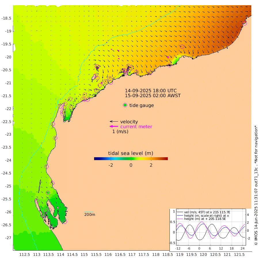 3cm/s 39T +12cm/s rms + 5cm/s -173T. NWSBAR 206m 6cm/s 40T +22cm/s rms + 10cm/s -148T. TAN100 109m 9cm/s 102T +11cm/s rms + 8cm/s -129T. PIL200 208m 14cm/s 114T +13cm/s rms + 7cm/s -137T. PIL100 105m 16cm/s 116T +12cm/s rms + 2cm/s -92T. PIL050 55m 6cm/s 43T +18cm/s rms + 4cm/s -149T. NRSNIN 61m 21cm/s 109T +6cm/s rms + 3cm/s 112T. NW Shelf M6 65m 42cm Withnell Point 31cm Denham 29cm Shark Bay (Inr Bn) 32cm Shark Bay 21cm Useless Loop -14cm Hamelin Pool 63cm Carnarvon 59cm Cape Cuvier 62cm Coral Bay 62cm Norwegian Bay 97cm Badjirrajirra 67cm Tantabiddi 80cm Point Murat 88cm Exmouth 97cm Learmonth 90cm Y Island 77cm North Muiron Island 86cm Roller 90cm Ashburton North 94cm Onslow (Beadon Creek) 92cm Thevenard Island 98cm Large Island 132cm North Sandy Island 113cm Barrow Island (Wapet Landing) 126cm Barrow Island (Tanker Mooring) 150cm Withnell Bay 106cm Trimouille Island 100cm North West Island 101cm Fortescue Road 149cm Steamboat Island 139cm Sholl Island 146cm Fairway Beacon 151cm Mawby Island 150cm Dampier (King Bay) 151cm Cape Legendre 150cm Hauy Island 175cm Port Walcott (Cape Lambert) 179cm Depuch Island 210cm Port Hedland 205cm Bedout Island 226cm Lagrange Bay